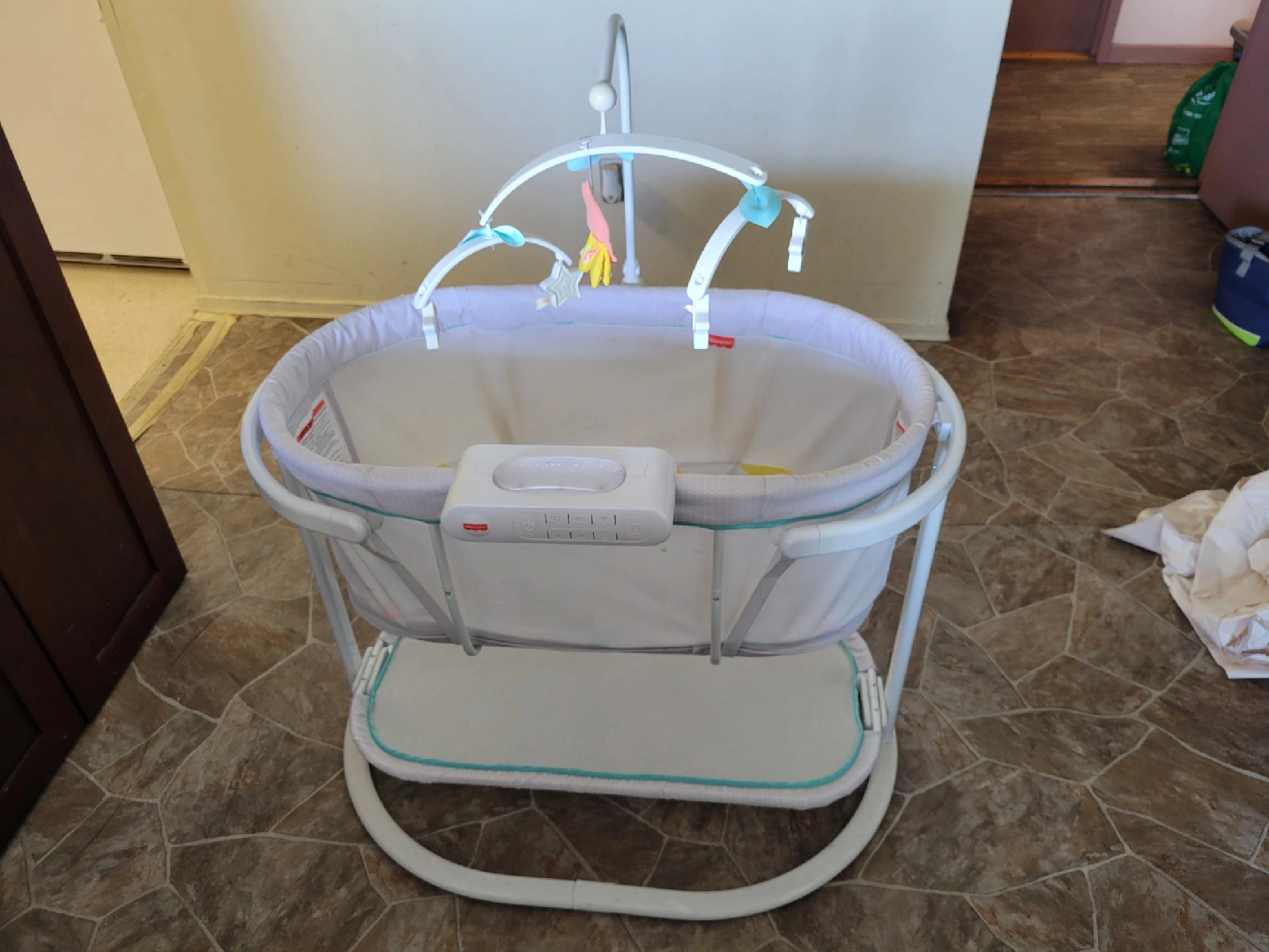 10Looking to sell our Fisher-Price Soothing Motions Bassinet! It's in great condition and ready for a new little one. This bassinet gently soothes your baby with calming vibrations, music, and sounds. It's lightweight and easy to move from room to room, so you can keep your baby close by. Plus, the overhead mobile with toys helps stimulate your baby's developing senses. Perfect for newborns!