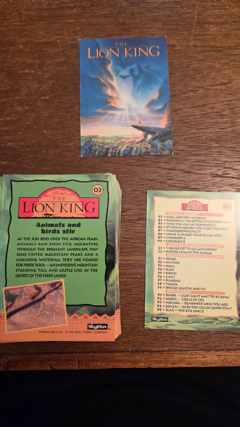 Selling a collection of The Lion King trading cards by Skybox. These cards feature scenes and characters from the classic Disney movie. Great for any Lion King fan or collector!