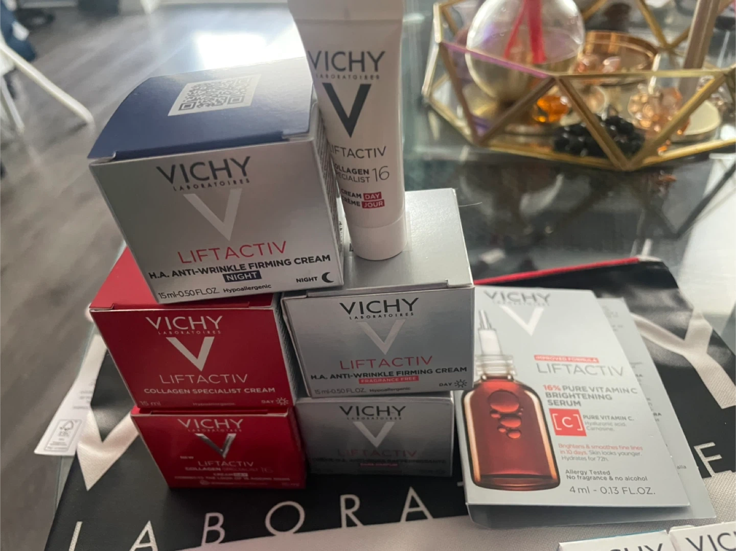 collection of Vichy LiftActiv skincare products! Included are the H.A. Anti-Wrinkle Firming Cream (Night and Day), Collagen Specialist Cream (Night and Day), and the 16% Pure Vitamin C Brightening Serum.