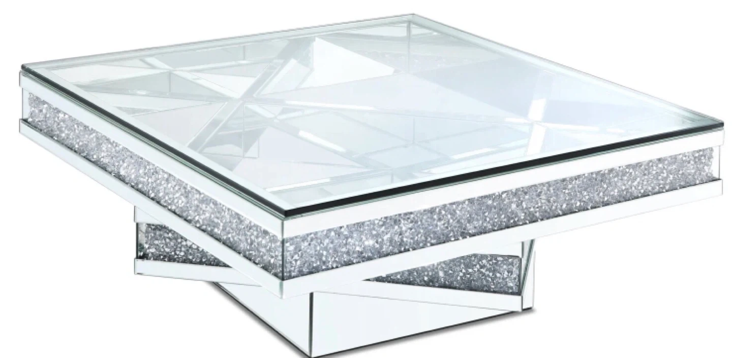 Selling a mirrored coffee table! It has a unique design with a glass top and mirrored sides. There are some cracks on the side mirror as shown in the pictures