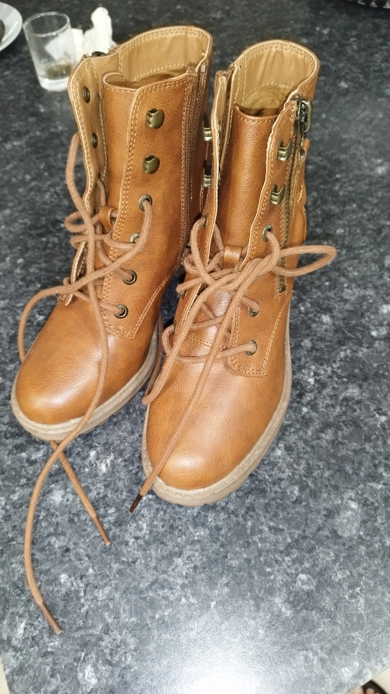 Selling a pair of brown ankle boots in size 7. They feature a stylish design with laces and a zipper detail. Originally bought for $79.99, these boots are in good condition and ready for a new home!