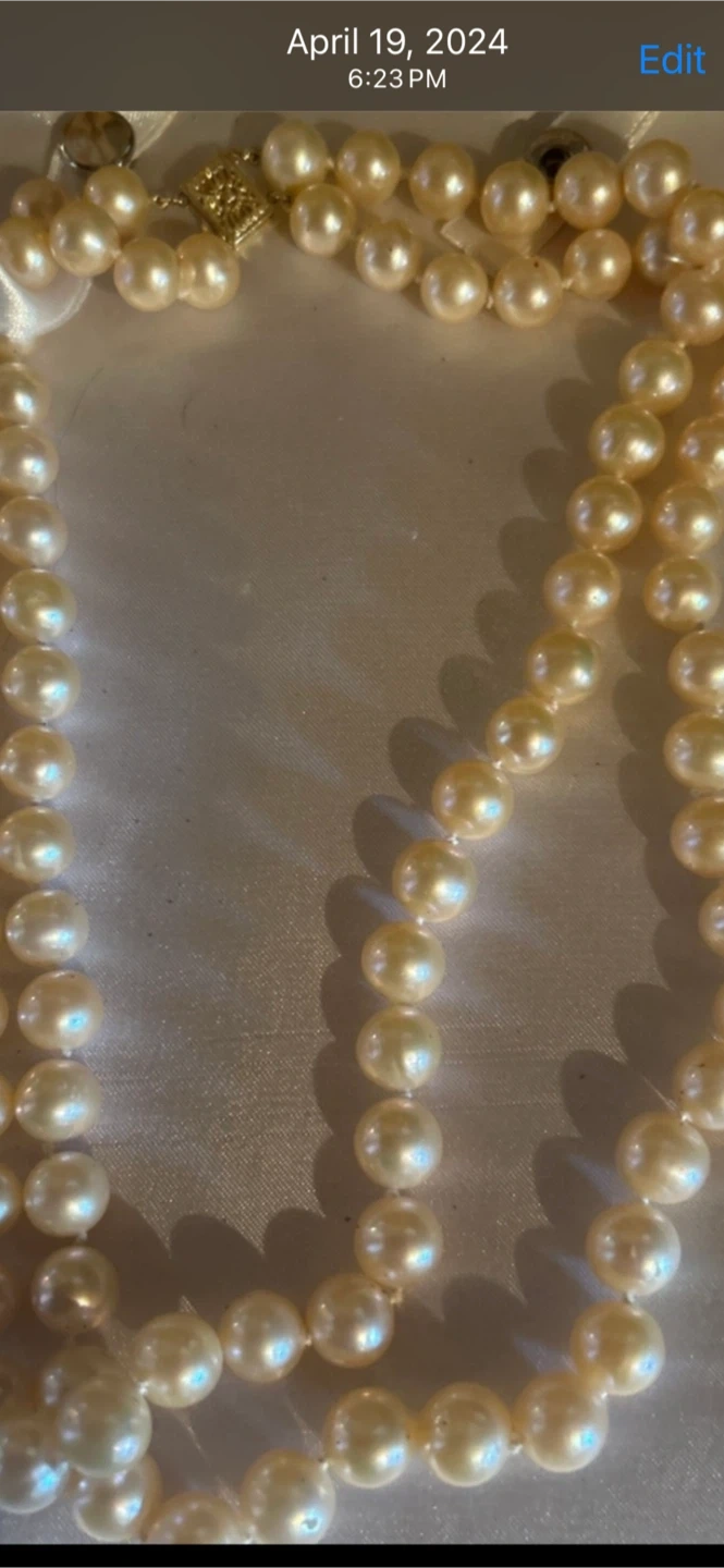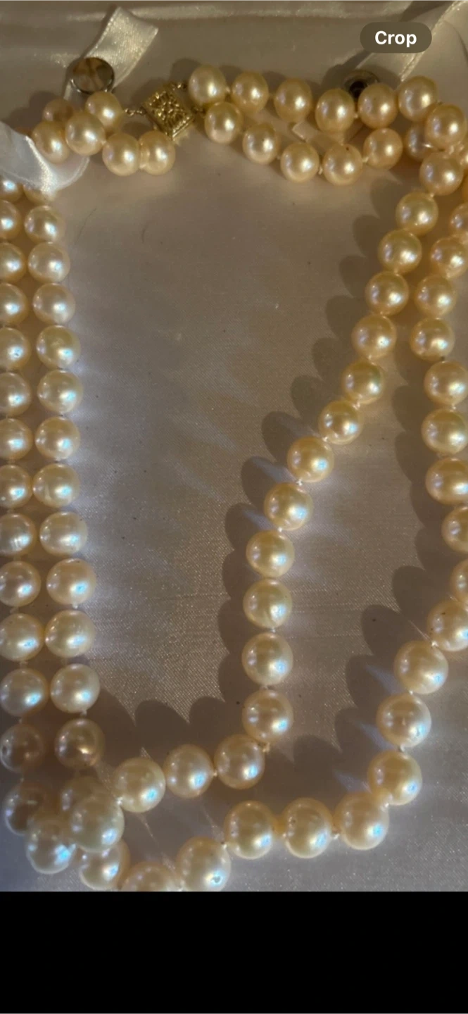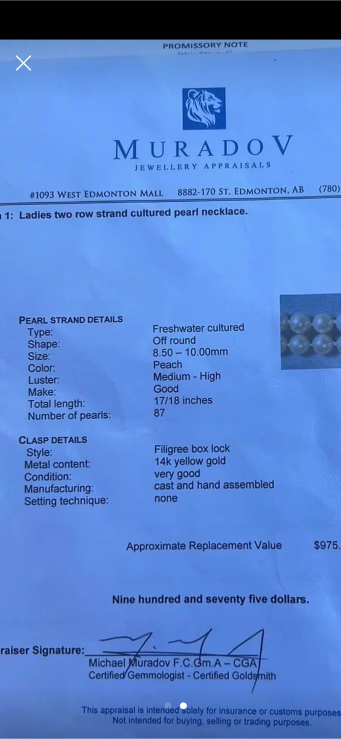 1000+Selling a beautiful two-row strand cultured pearl necklace. Pearl Strand Details: - Type: Freshwater cultured - Shape: Off round - Size: 8.50 - 10.00mm - Color: Peach - Luster: Medium - High - Length: 17/18 inches - Number of pearls: 87 Clasp Details: - Style: Filigree box lock - Metal content: clasp - Condition: very good Appraisal included, with an approximate replacement value of $975 + GST. Selling for 200
