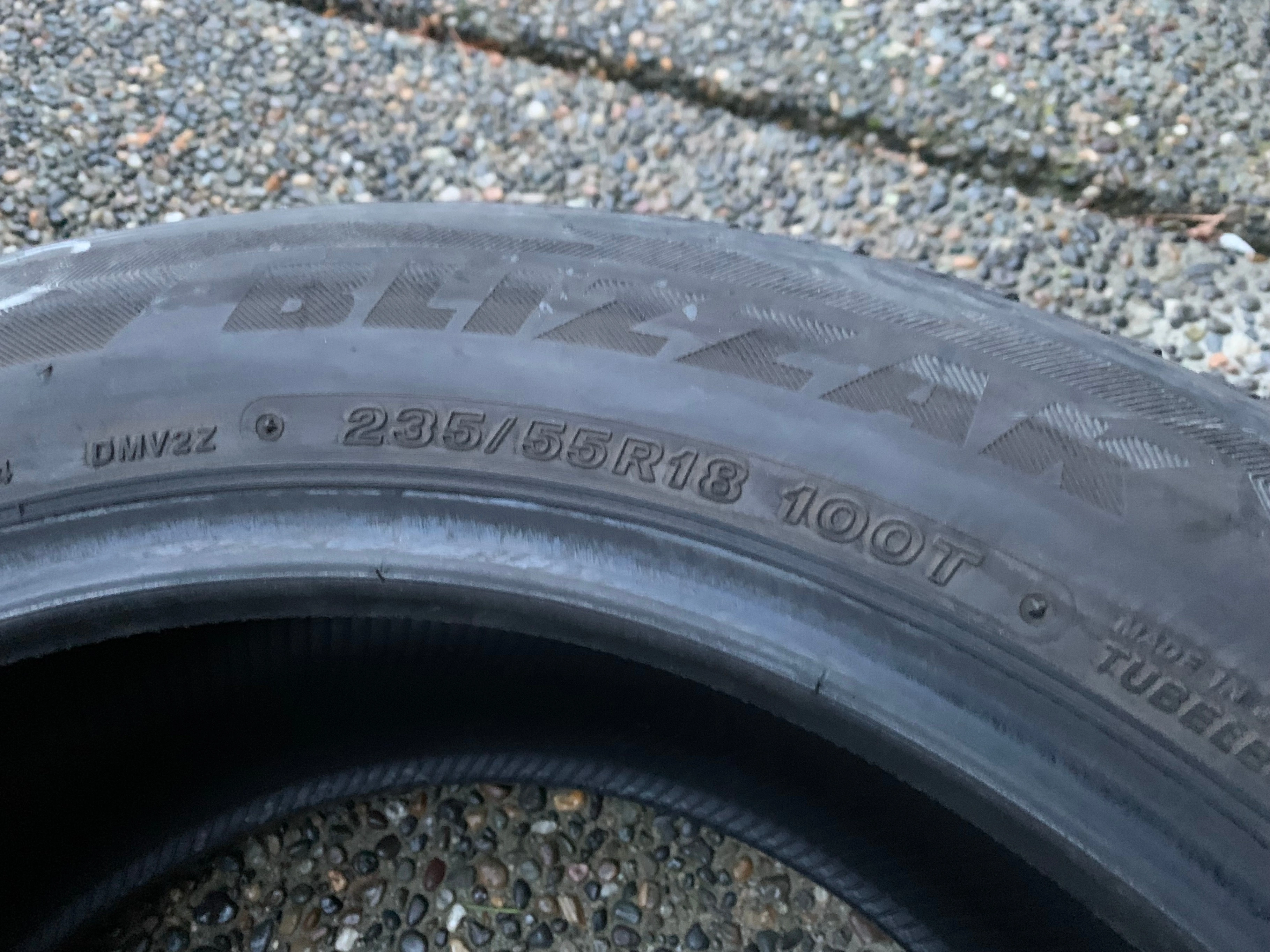 60a nice Bridgestone winter tire in great shape with tons of tread (1 TIRE ONLY) size 235/55/18 101T M+S Bridgestone Blizzak DMV2 with no repairs and 90% tread come grab it for only $125 or pay well over $250 plus taxes for a new one huge savings take advantage $$$ come get the bargain $$$ (1 TIRE ONLY) I also have these tires available in the same size if interested:- 2 X 235/55/18 100H M+S Toyo Open Country A20 np 65% tread 1 X 235 55 18 235/55/18 99T M+S Michelin latitude tour np 98% tread Lnew we are located in Surrey BC but can also deliver into vancouver island or anywhere in canada or pickup locally in newton surrey or fleetwood surrey NOTE: Vancouver Island: victoria or nanaimo $15 FLAT RATE delivery charge (PER TIRE) if I have enough appointments booked to justify the trip cost to come over. leave ph no and Ill get you a date for expected delivery with this option. otherwise i can get you a shipping quote but will need a full ship to address.