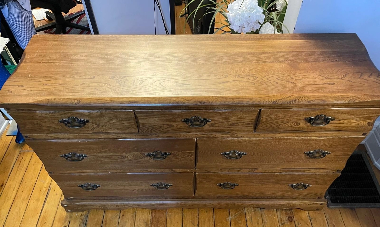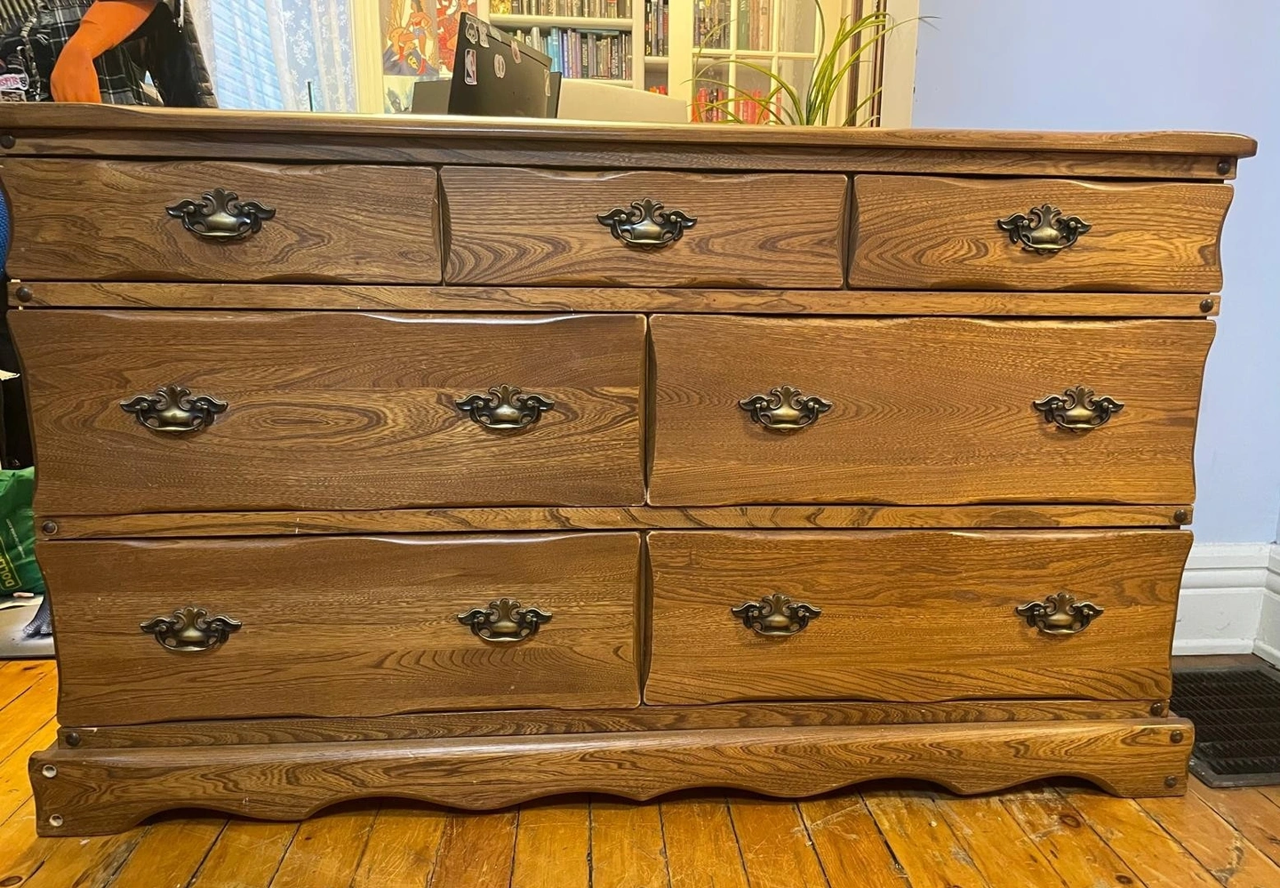112Upgrade your space with this beautiful mid-century dresser, crafted from solid walnut and chestnut wood. Its timeless design and durable build make it both a functional storage piece and a statement of style. Features: - Mid-century modern design - Solid walnut and chestnut construction - 7 spacious drawers for storage - Dimensions: H 32.25" (82 cm) x W 56" (142 cm) x D 17.25" (44 cm) - Warm walnut finish in excellent condition Condition: - Solid wood, sturdy and durable - Well-maintained and in excellent shape - Ready to use immediately Pickup near Queen & Broadview, Toronto Delivery within Toronto for $20 Payment: Cash, e-Transfer, Credit Card Contact: Text Luis at 647.540.4863 or email [**escobarandino@gmail.com**](mailto:escobarandino@gmail.com) to arrange pickup or ask questions.