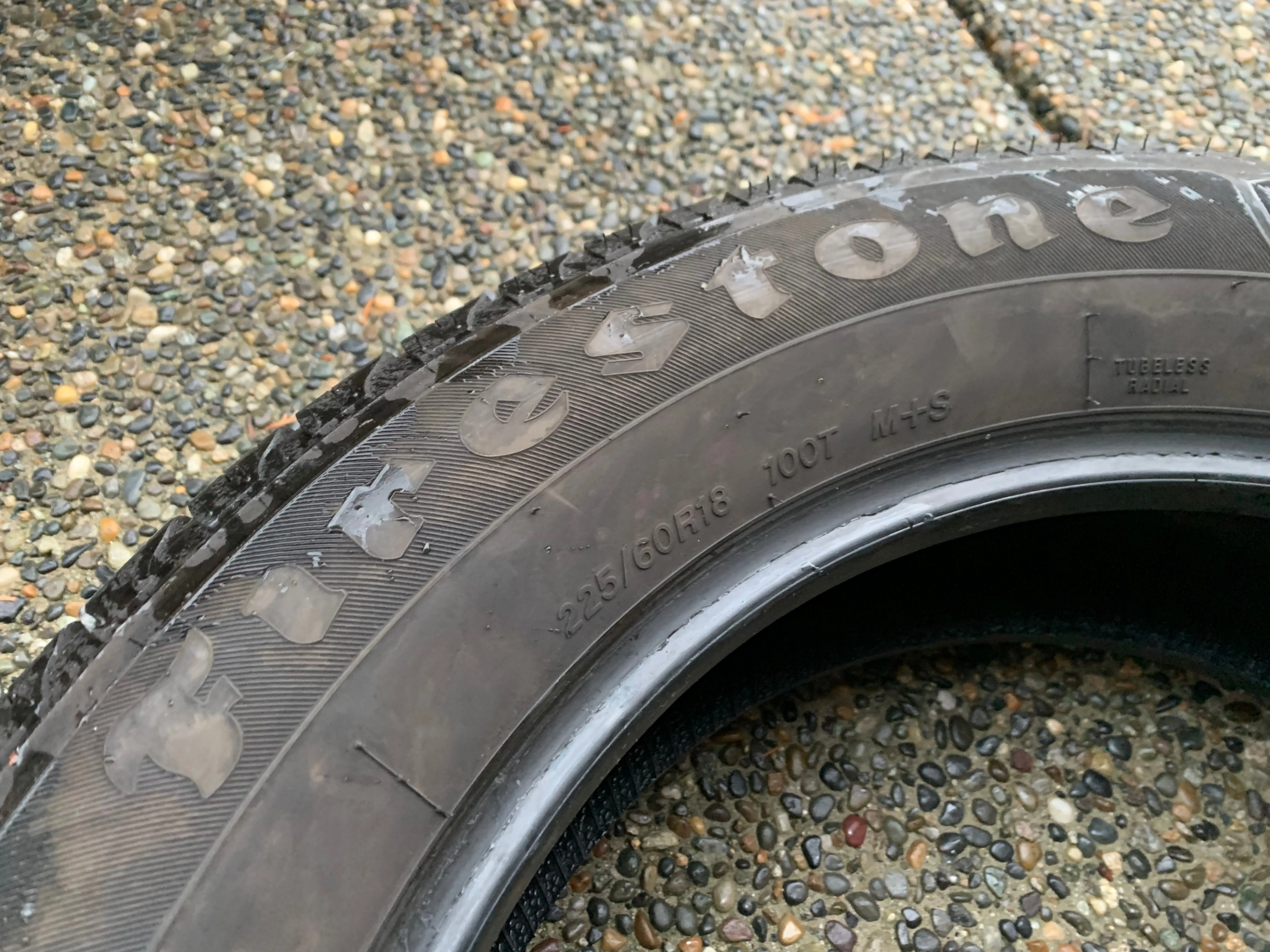 60a nice all season firestone in great shape (1 TIRE ONLY) size 225/60/18 100T M+S Firestone All Season with 65% tread This tire has been professionally repaired and tested with no leaks and no issues come grab it for only $95 or pay double the price for a new one huge savings take advantage $$$ come get the bargain $$$ (1 TIRE ONLY) I also have these tires available in the same size if interested:- 1 x 225 60 18 225/60/18 100H M+S Uniroyal Tiger Paw Touring A/S np 90% tread 1 x 225/60/18 100H M+S Falken Wildpeak A/T Trail 01A np 70% tread 1 X 225/60/18 100H M+S continental pro contact TX np 70% tread 1 X 225/60/18 100H M+S Michelin Primacy A/S np 80% tread 1 x 225/60/18100H M+S Bridgestone Ecopia H/L 422 Plus 75% tread 1 x 225/60/18 100H M+S Yokohama Avid GT 90% tread 1 x 225/60/18 100H M+S Falken Ziex ZE001 A/S np 60% tread 3 X 225/60/18 100H M+S Firestone weathergrip np 80/85% tread we are located in Surrey BC but can also deliver into vancouver island or anywhere in canada or pickup locally in newton surrey or fleetwood surrey NOTE: Vancouver Island: victoria or nanaimo $15 FLAT RATE delivery charge (PER TIRE) if I have enough appointments booked to justify the trip cost to come over. leave ph no and Ill get you a date for expected delivery with this option. otherwise i can get you a shipping quote but will need a full ship to address.