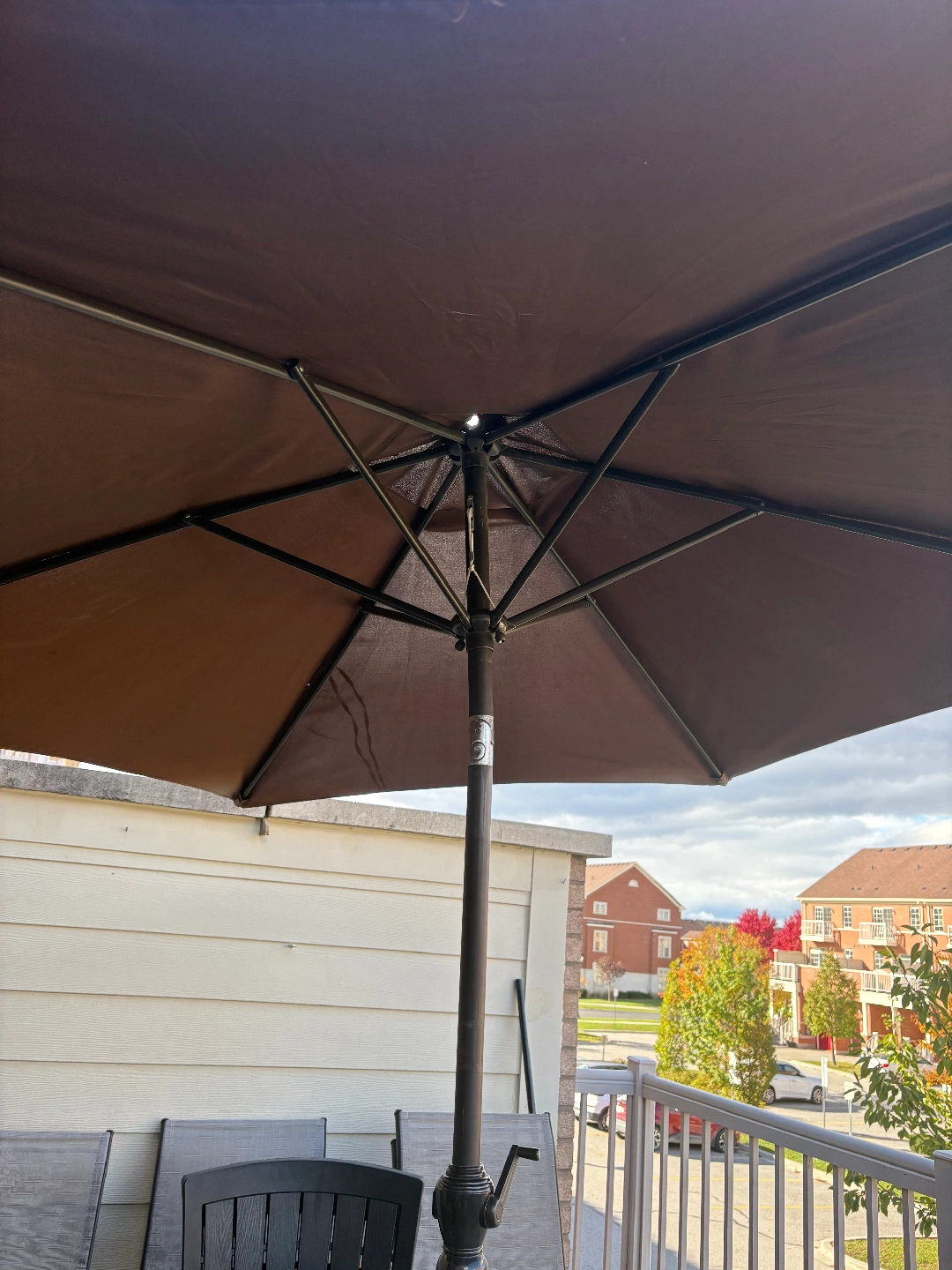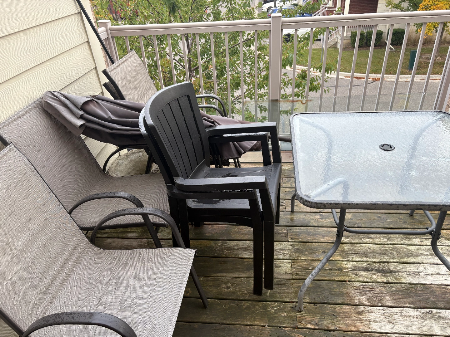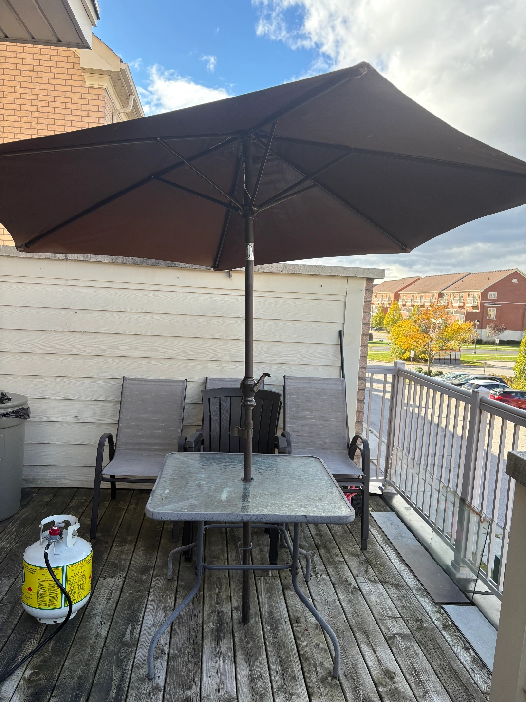 65Selling a complete patio set! Includes a glass-top table, a large umbrella, and four comfortable chairs. Perfect for enjoying the outdoors this summer! (If you'd like, I can also give you two brown chairs.)