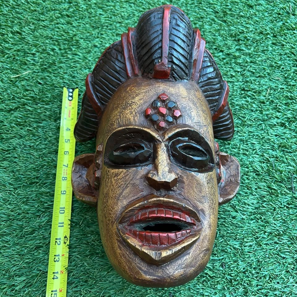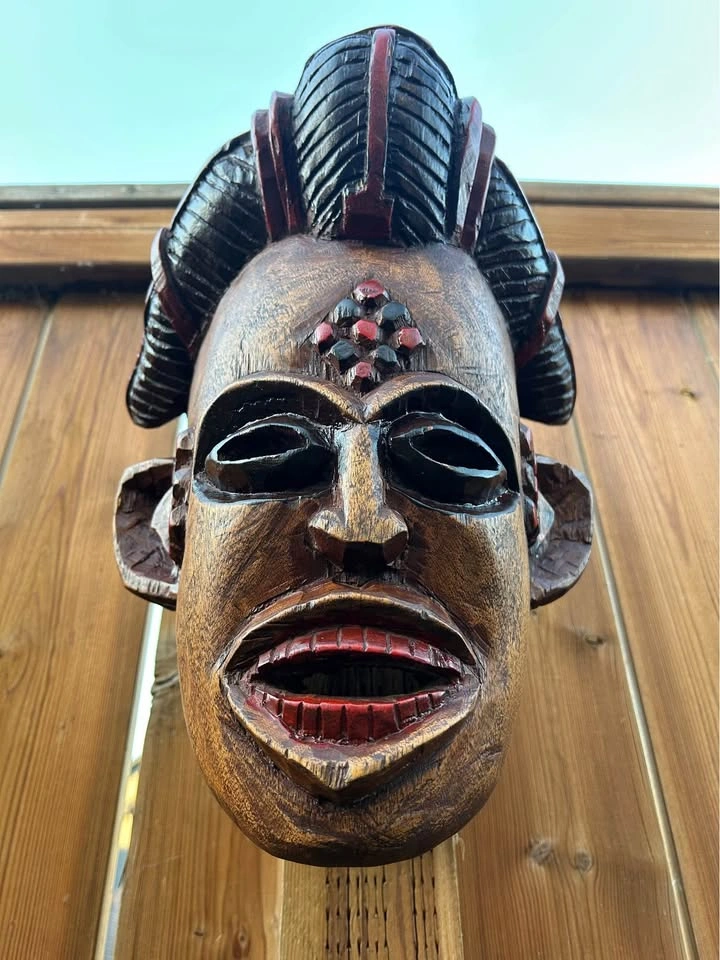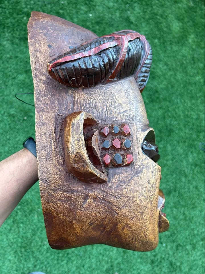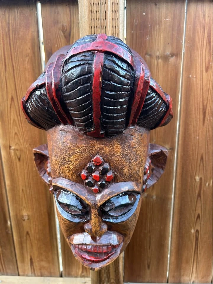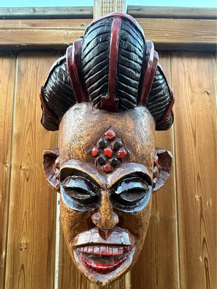 670Large vintage African tribal mask, hand-carved from solid wood with traditional red and black painted accents. Features expressive facial details, geometric carvings, and a striking headdress design — a bold piece of folk craftsmanship with great character and natural patina. Material: Hand-carved solid wood Heavy and detailed piece Traditional red, black, and brown tones Condition: Vintage condition with minor surface wear consistent with age (see photos). Sturdy and ready for wall display. See photos for details and scale. Perfect for wall decor, ethnic art collections, or statement interior design. Pick up: Seton area, Calgary. See also my other lots. Open to your questions and suggestions. If necessary, I provide additional photos. These are not new things, so please look carefully at the photos and videos.