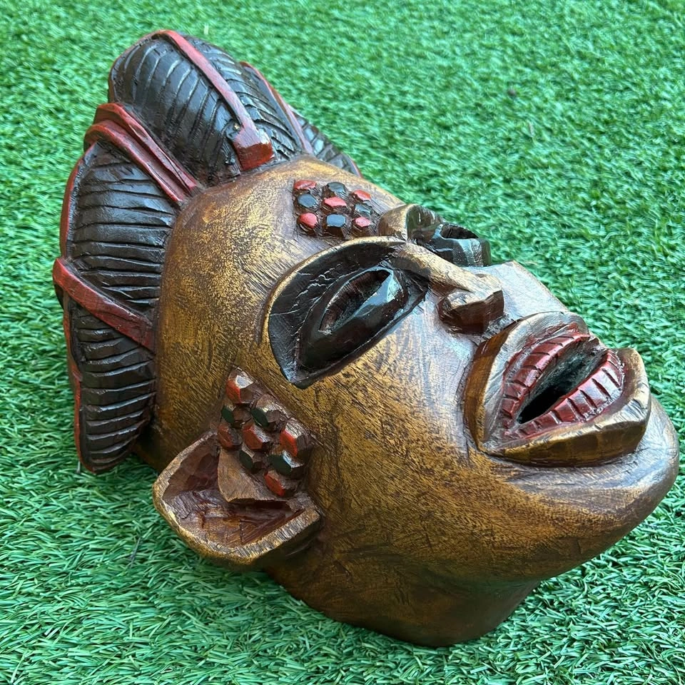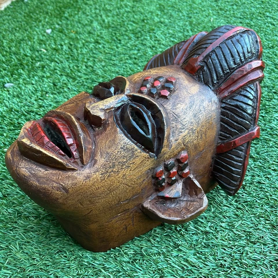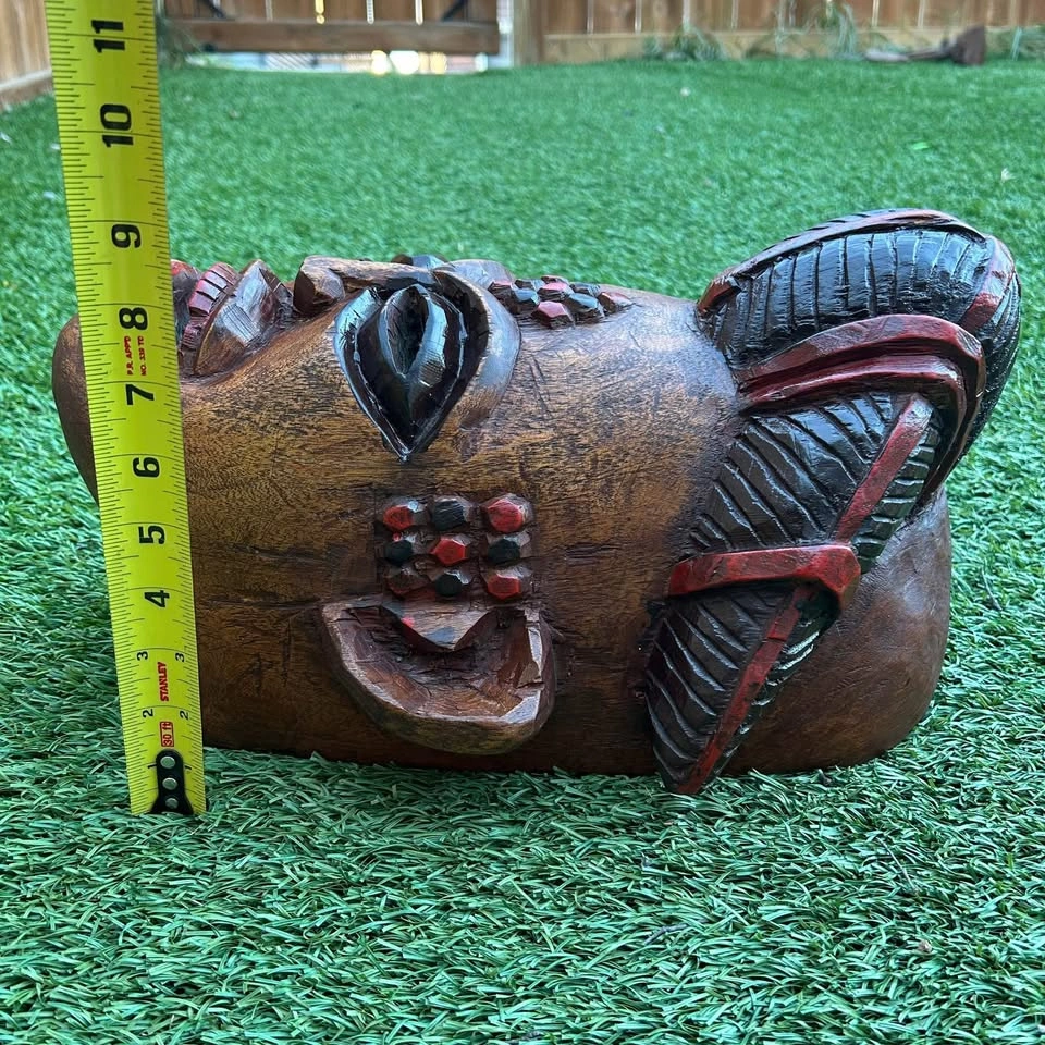 670Large vintage African tribal mask, hand-carved from solid wood with traditional red and black painted accents. Features expressive facial details, geometric carvings, and a striking headdress design — a bold piece of folk craftsmanship with great character and natural patina. Material: Hand-carved solid wood Heavy and detailed piece Traditional red, black, and brown tones Condition: Vintage condition with minor surface wear consistent with age (see photos). Sturdy and ready for wall display. See photos for details and scale. Perfect for wall decor, ethnic art collections, or statement interior design. Pick up: Seton area, Calgary. See also my other lots. Open to your questions and suggestions. If necessary, I provide additional photos. These are not new things, so please look carefully at the photos and videos.