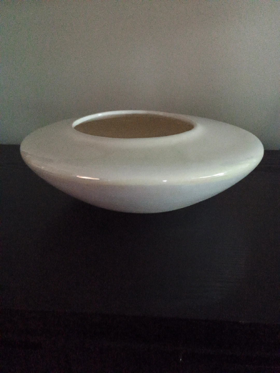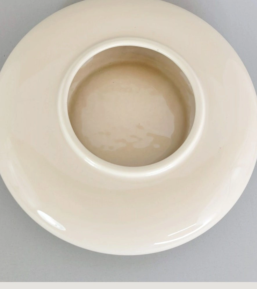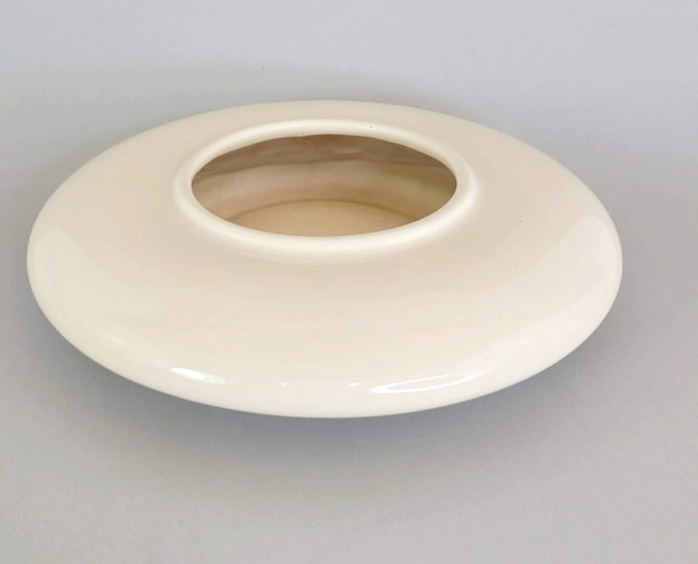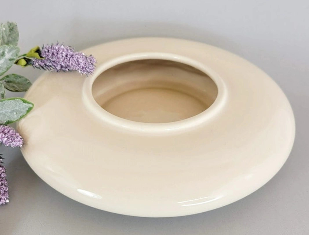 Cream color pottery Ikebana ceramic vase or planter, UFO shaped, 10" in diameter.