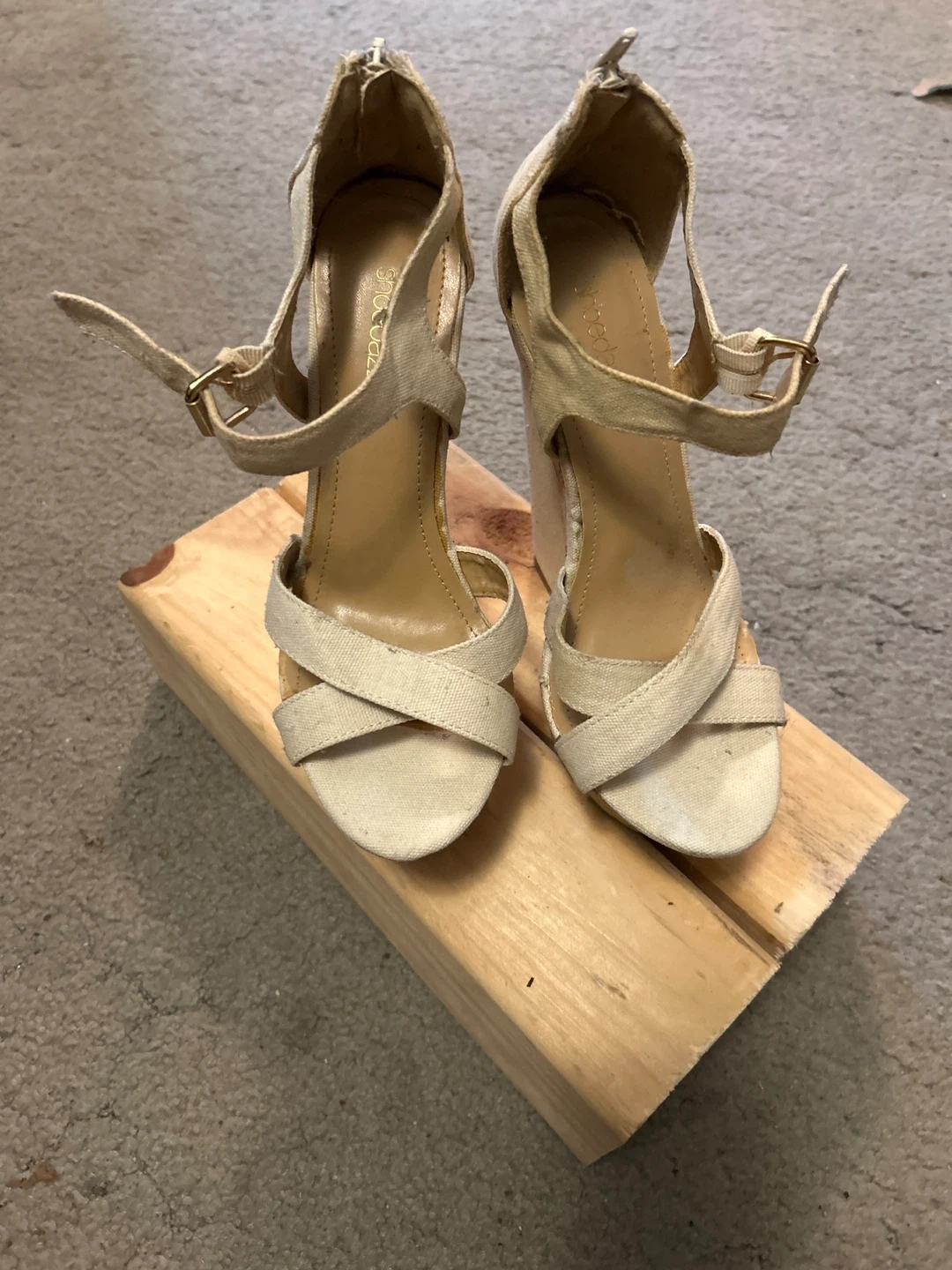 Giving away a pair of ShoeDazzle wedge heels in a size 8. They have a cork wedge and a zip closure on the back. Though these haven’t been worn outside. They have some stains from being in storage. They are really cute, and if you want to invest the effort to clean them: they can be like new for you.