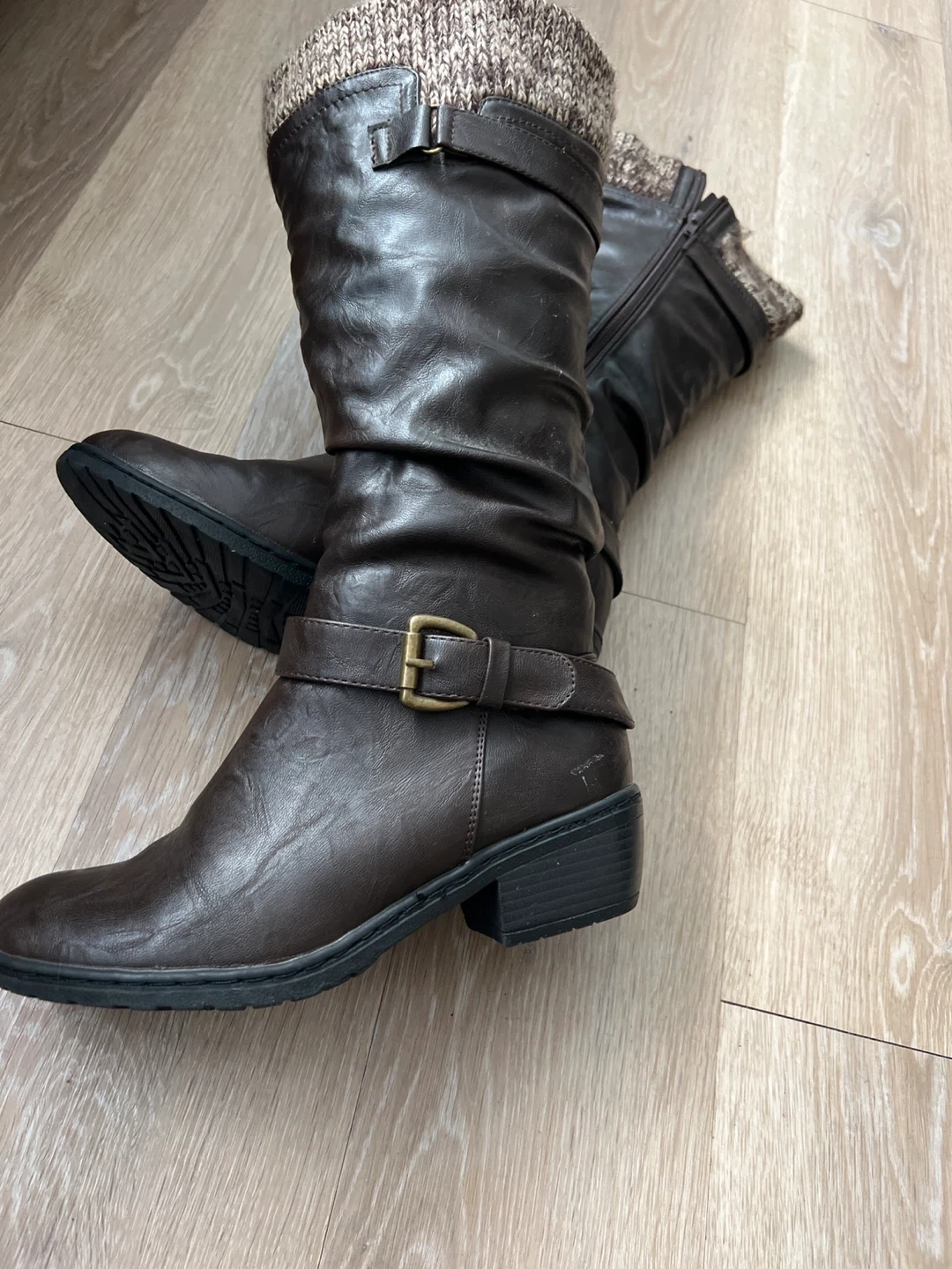 Selling a pair of brown knee-high boots in size 8-9. They have a knitted top and a buckle detail. Perfect for fall and winter! Heel is 1.5 inches. I feel the boot is more like a size 8