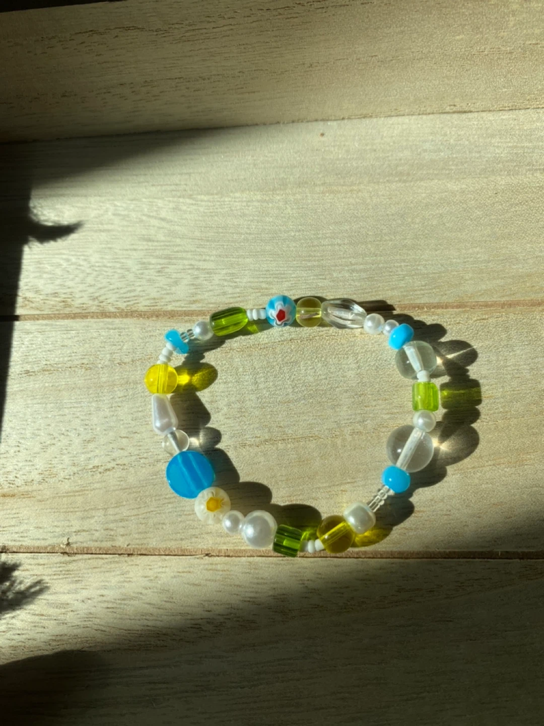 1000+a cute beaded bracelet! It features a mix of blue, green, yellow, and white beads. Perfect for adding a pop of colour to any outfit