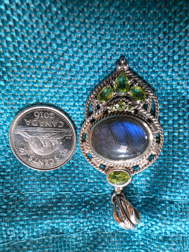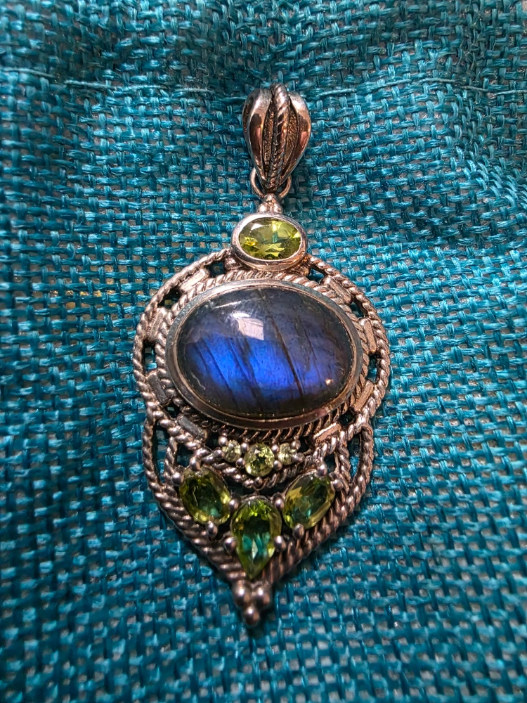 10Beautiful sterling silver pendant featuring a labradorite stone and peridot accents! The pendant has intricate detailing and a unique design.