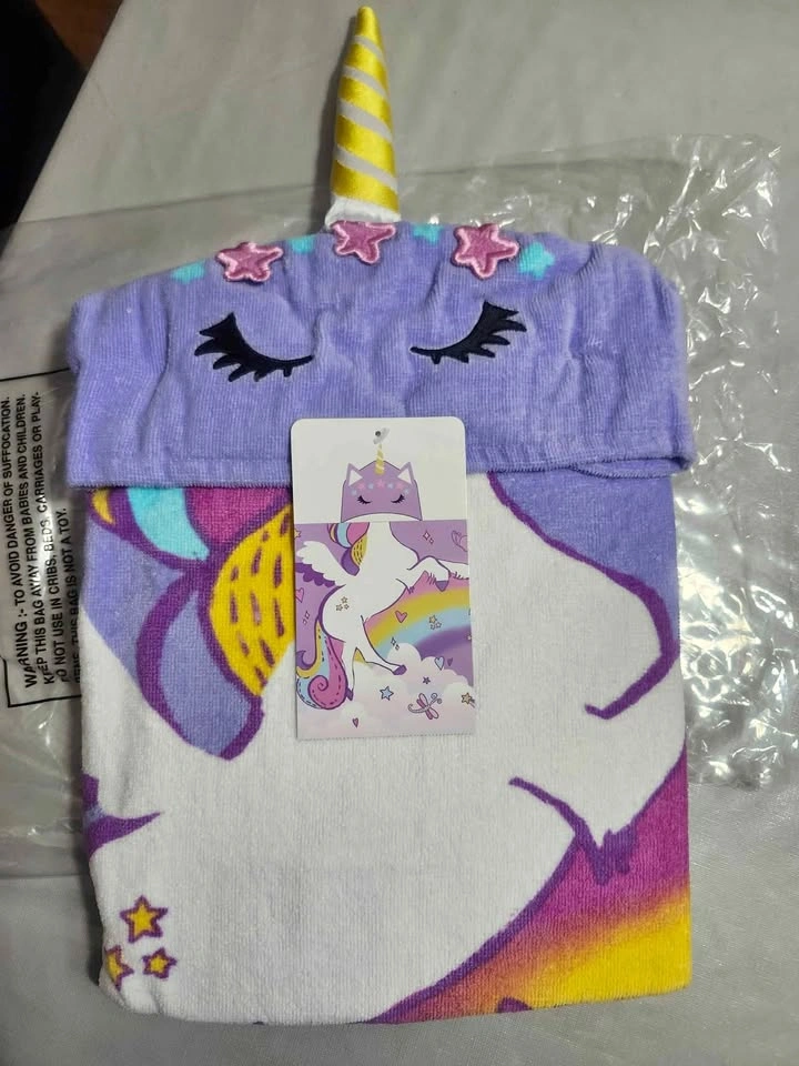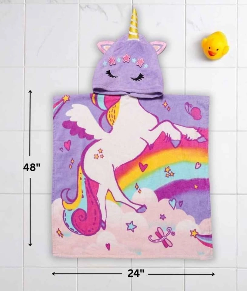 Adorable unicorn hooded towel poncho β perfect for kids! π Features a soft purple hood with unicorn horn, ears, and embroidered sleepy eyes, plus a magical rainbow unicorn design on the poncho.