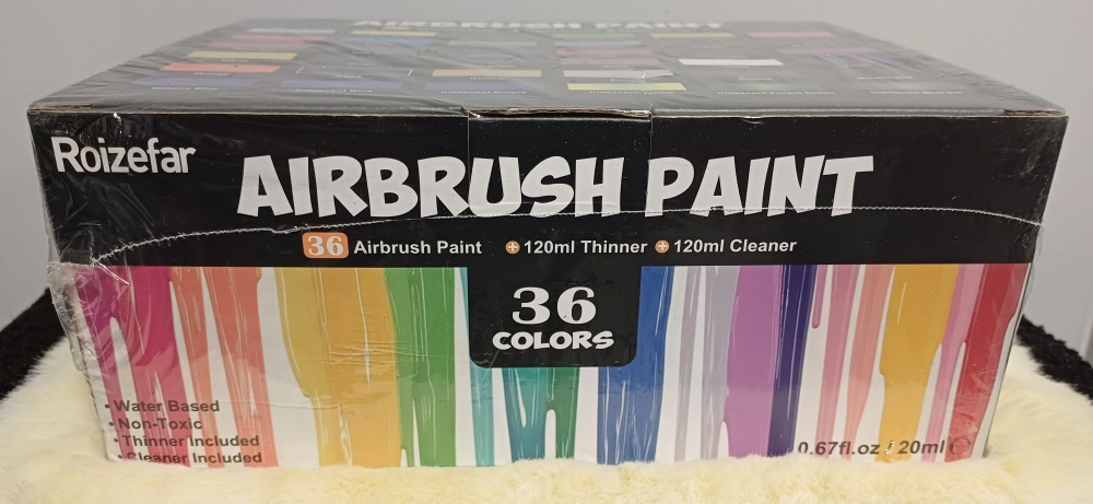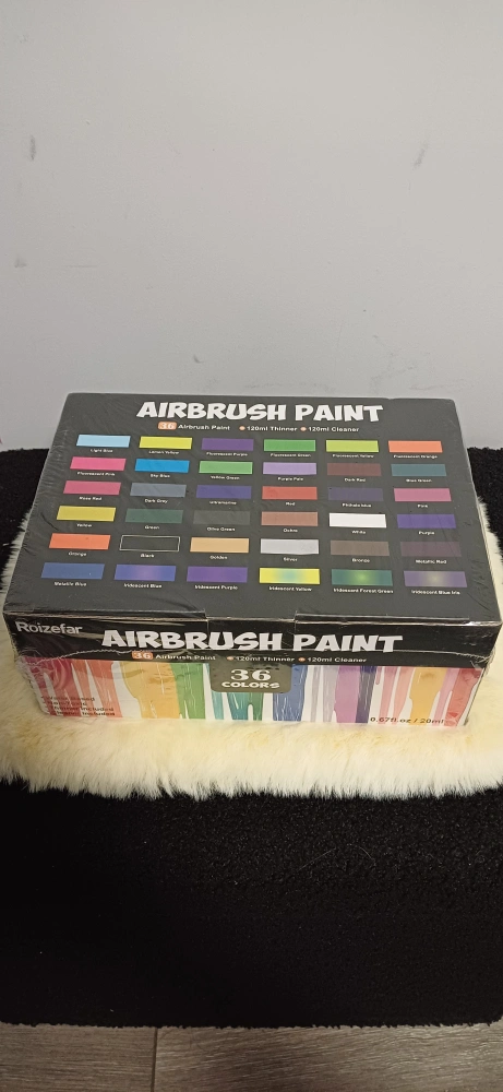 28I'm selling a brand new Roizefar Airbrush Paint set with 36 vibrant colours! This set includes: - 36 Airbrush Paints - 120ml Thinner - 120ml Cleaner Water-Based Air Brush Paints Acrylic Ready to Spray, Includes Iridescent, Metallic, Neon, Classic Colors, 20ml/Bottle Brandnew, still in a box, sealed. Perfect for all your airbrushing needs!