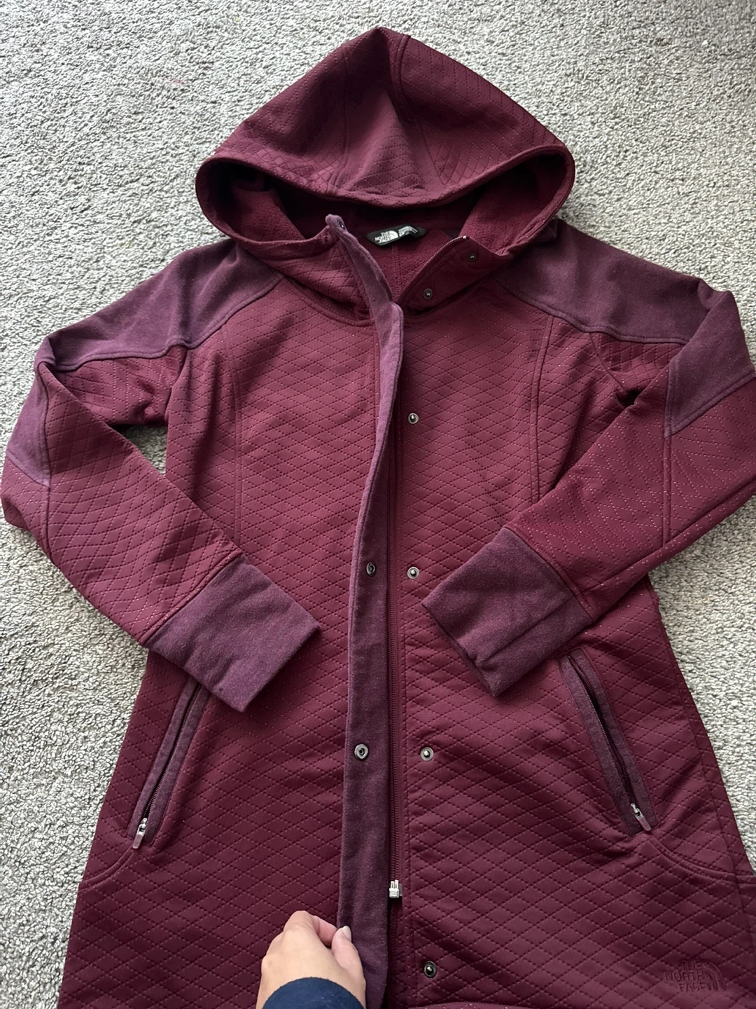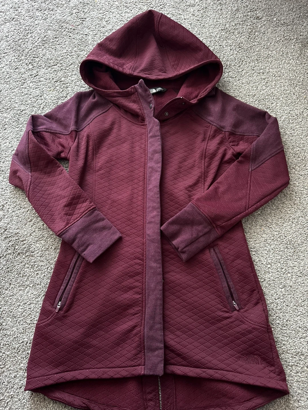 Selling a The North Face quilted jacket in a beautiful burgundy colour! It's a women's size small (S). Perfect for layering during the cooler months or wearing on its own on milder days. It's in great condition and ready for a new home!