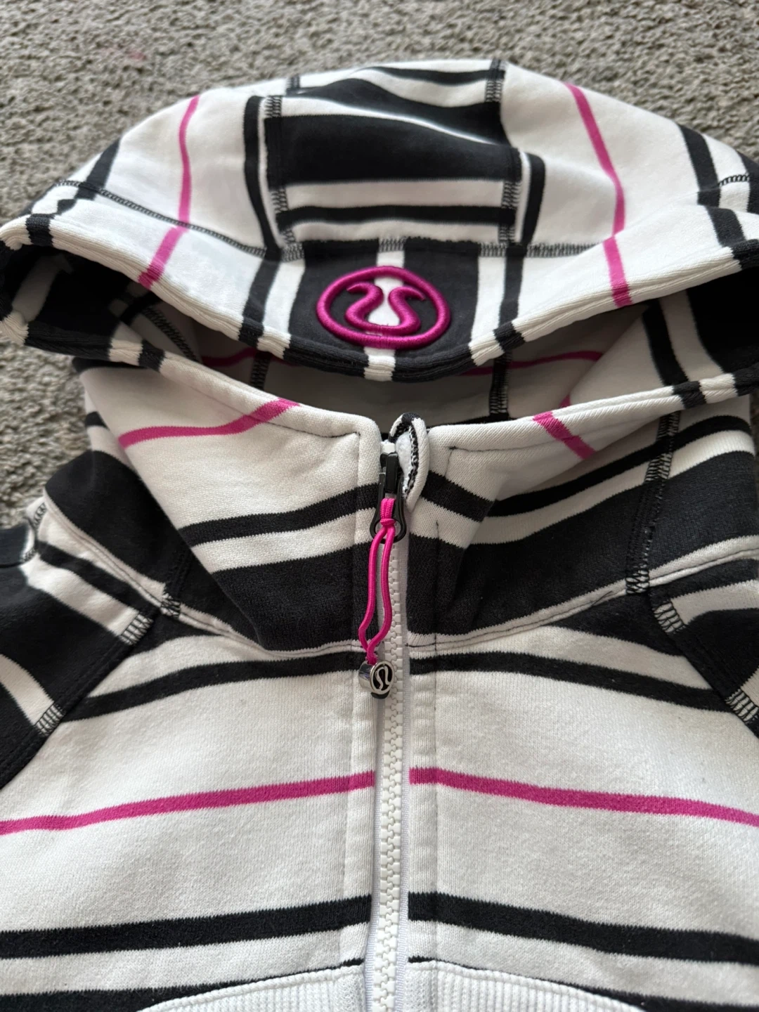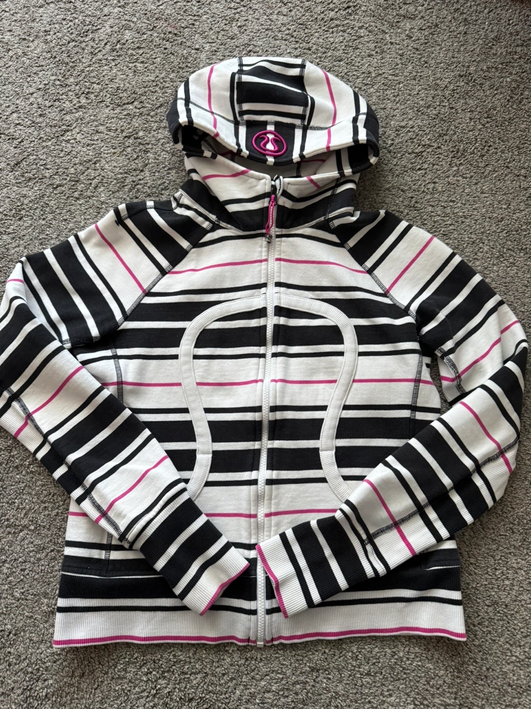 This Lululemon full zip hoodie features a stylish striped pattern in black, white, and pink. It's perfect for layering or wearing on its own. The hoodie is in great condition and ready for a new home!