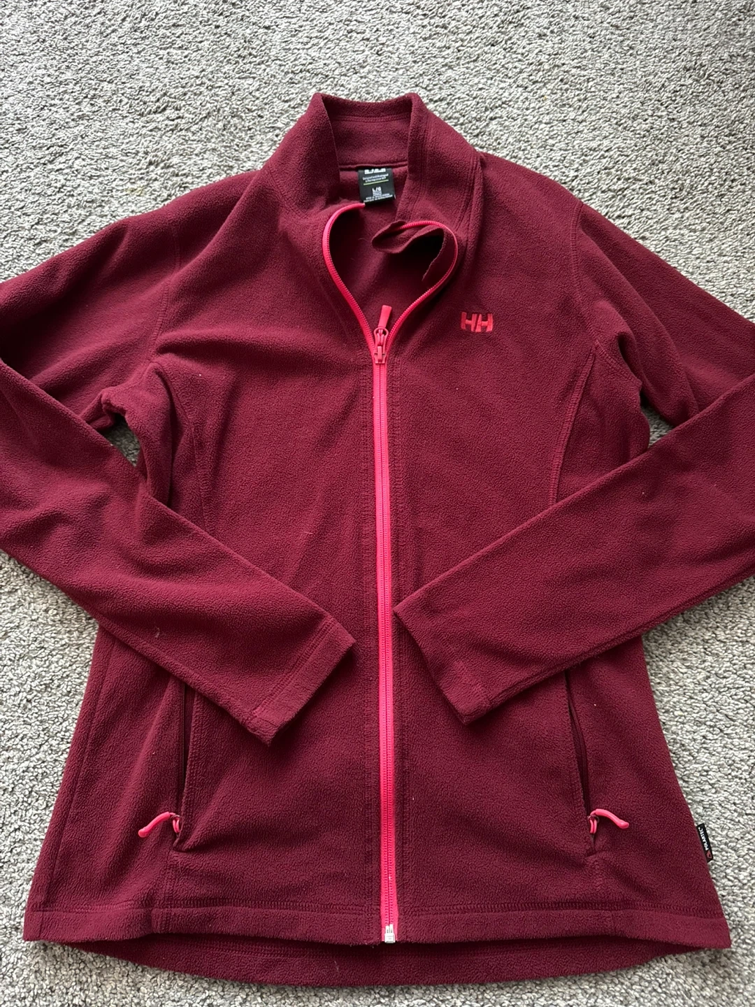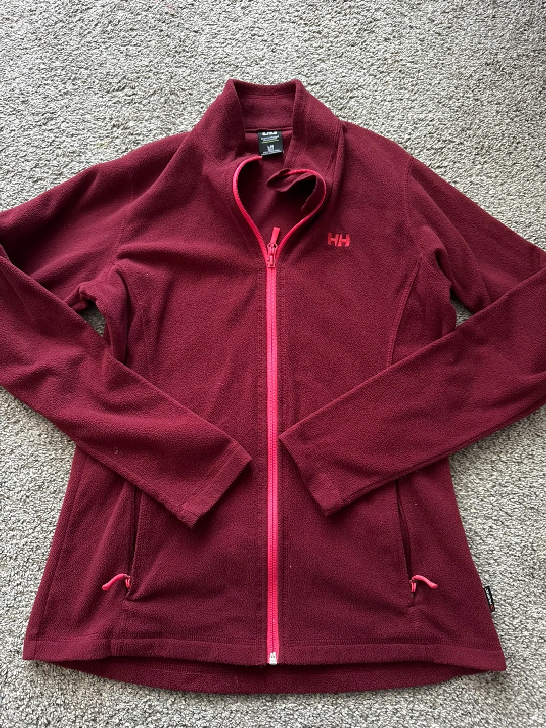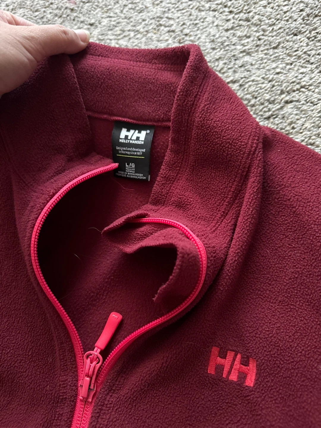 Cozy Helly Hansen fleece jacket in a lovely burgundy colour! It's a size large and perfect for layering or wearing on its own during cooler days. Great for staying warm and stylish!
