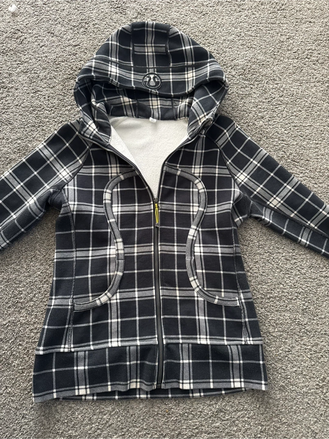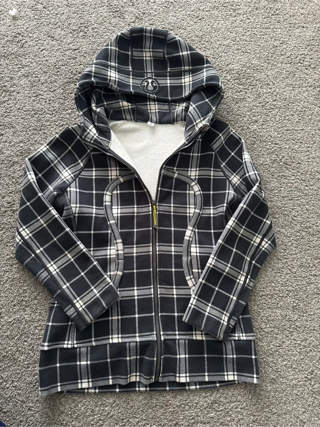 Selling a Lululemon Scuba Hoodie in a stylish black and white plaid pattern! This cozy hoodie is in great condition and features the classic Scuba design with a full zipper and comfortable fit. It's a size 8, perfect for layering or wearing on its own
