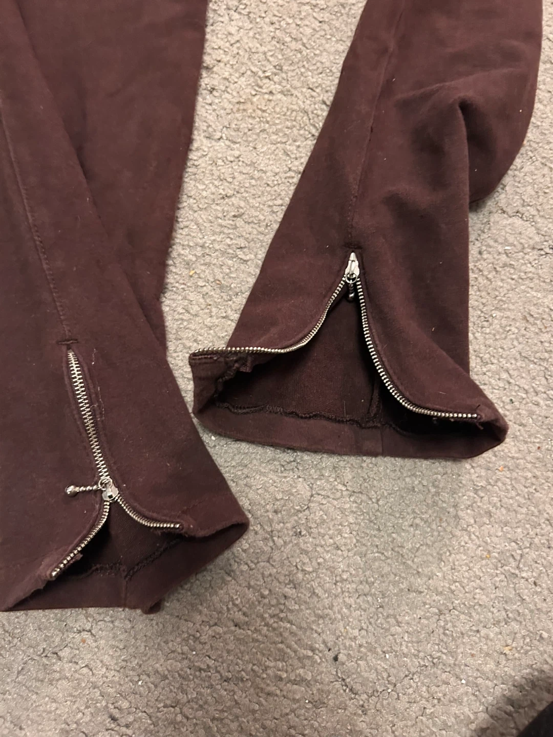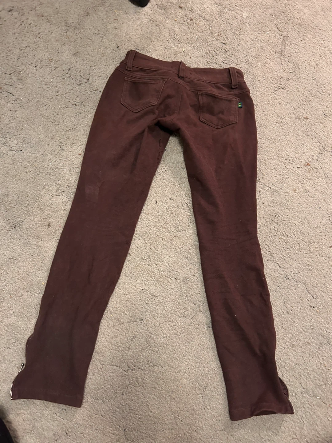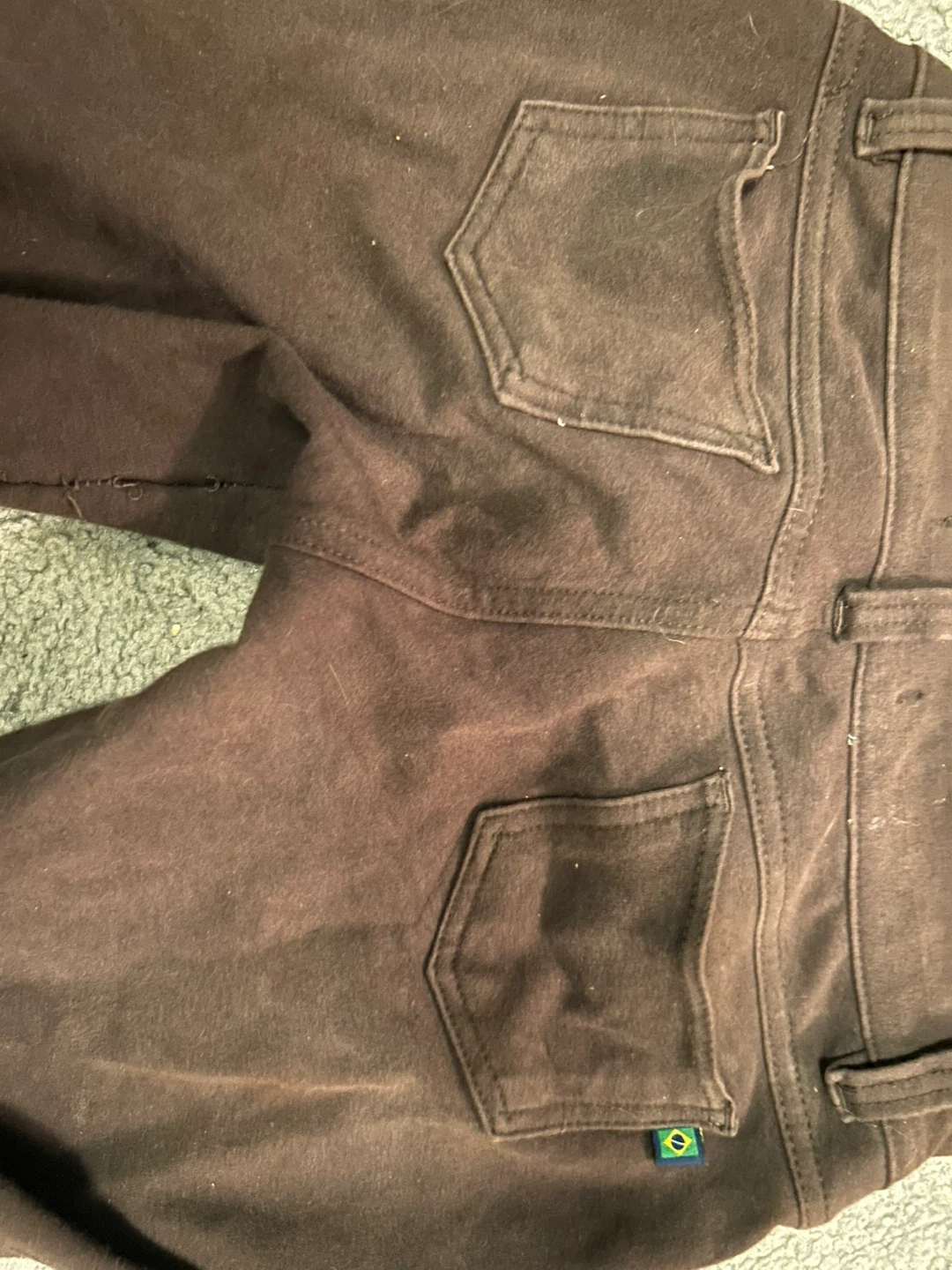 225Selling a pair of brown Brazilian “jeans”! They feature a unique zipper detail at the ankles and a comfortable fit. Great for casual wear or dressing up. They are in decent condition. The hem on the inner thigh is a little stretched, but they’re good quality and super comfortable. Size small/medium