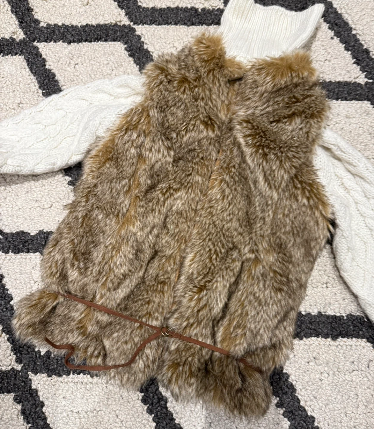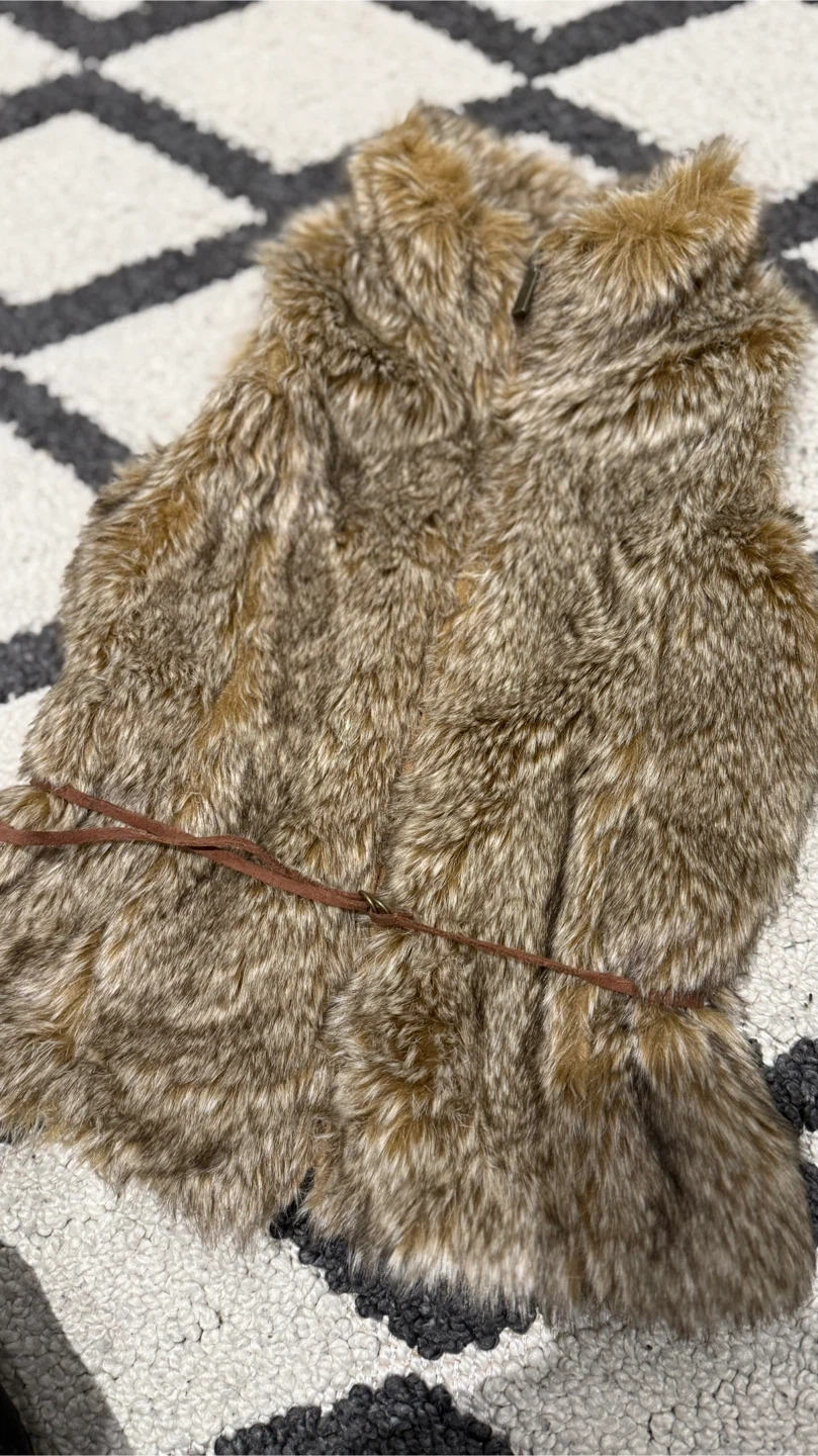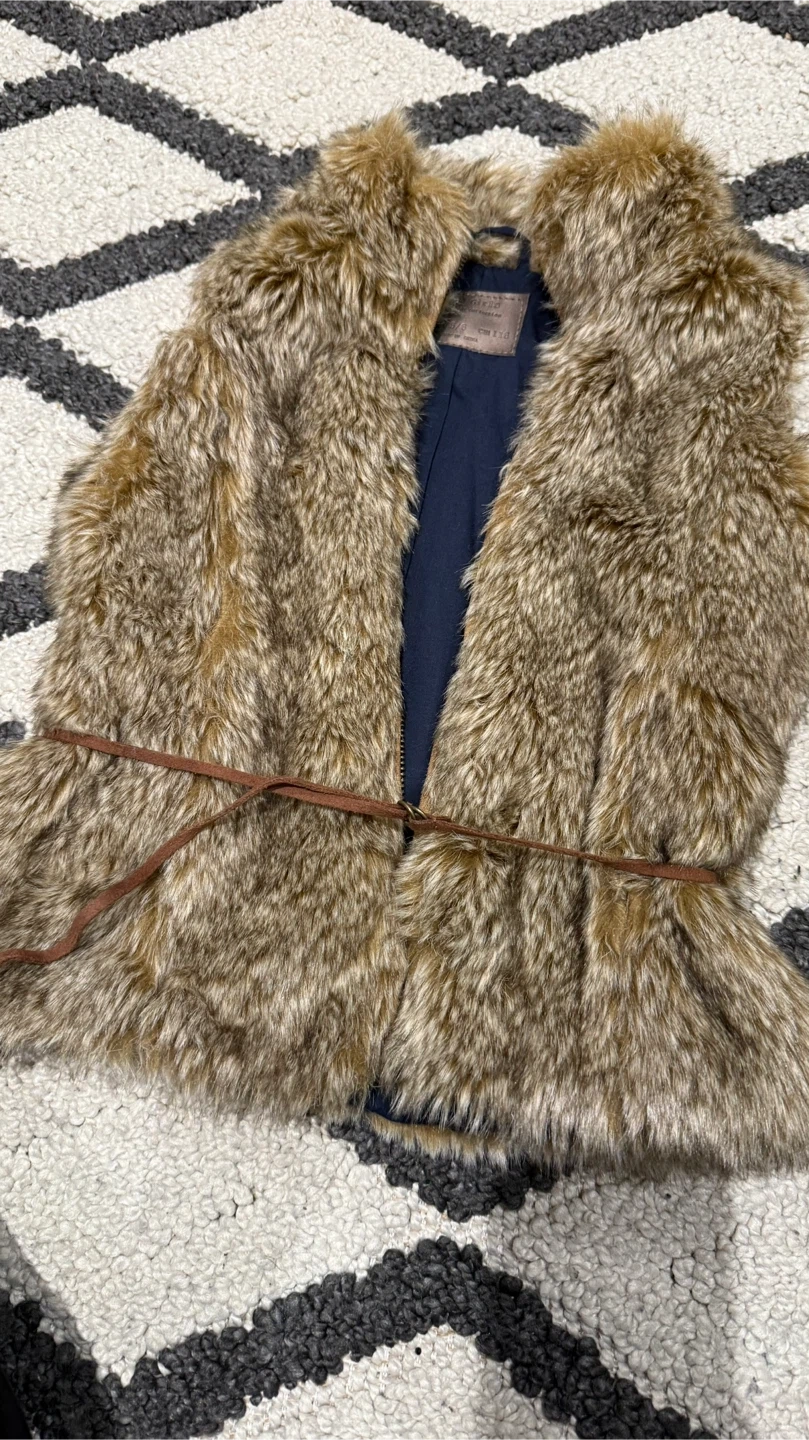 60Selling a cute Zara Girls faux fur vest in size 5/6. It features a brown faux fur exterior and a navy blue lining. Perfect for adding a stylish touch to any outfit!