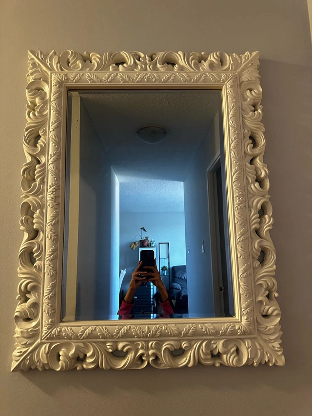 Add a touch of elegance to your home with this used ornate mirror. This mirror is in good condition and ready to enhance any room with its sophisticated design. Its detailed frame and reflective surface make it a stylish and functional piece of decor. Looking for a bit of magic to brighten up your space? This mirror doesn't just reflect light; it reflects style!