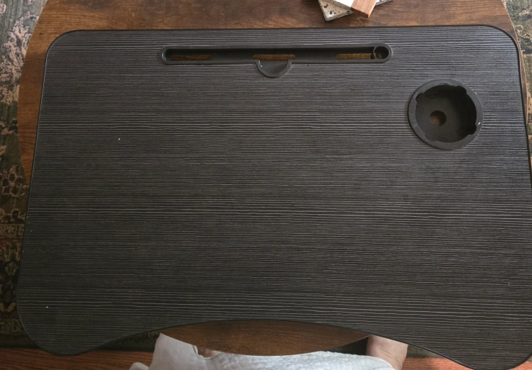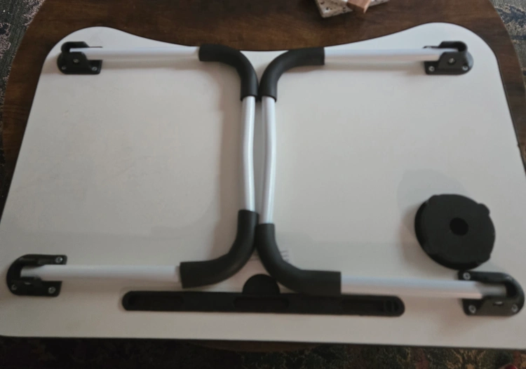 Selling a folding lap desk in black. It's in great condition and perfect for working or relaxing in bed or on the couch. It has a convenient cup holder and a slot for your tablet or phone. The legs fold easily for storage. Very heavy