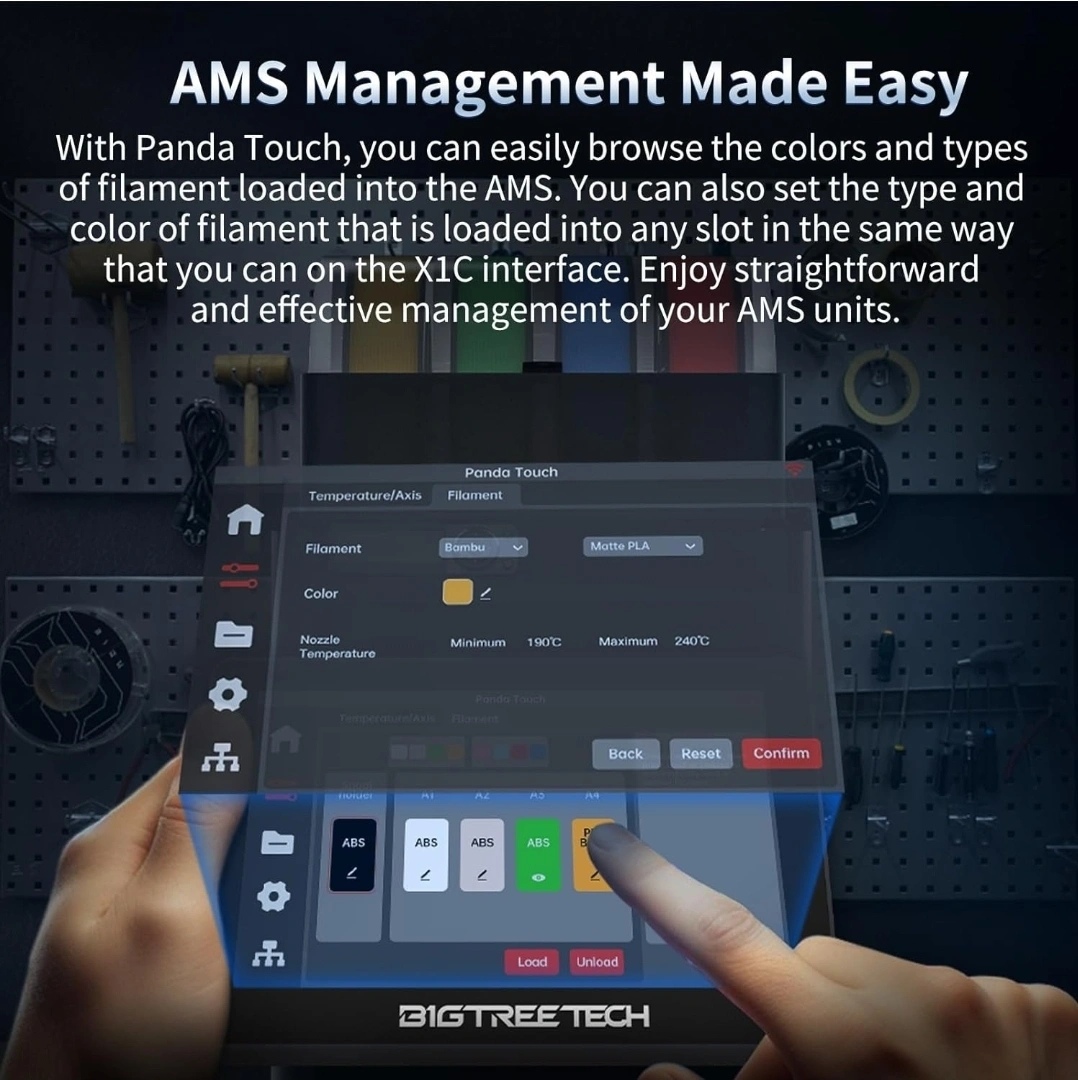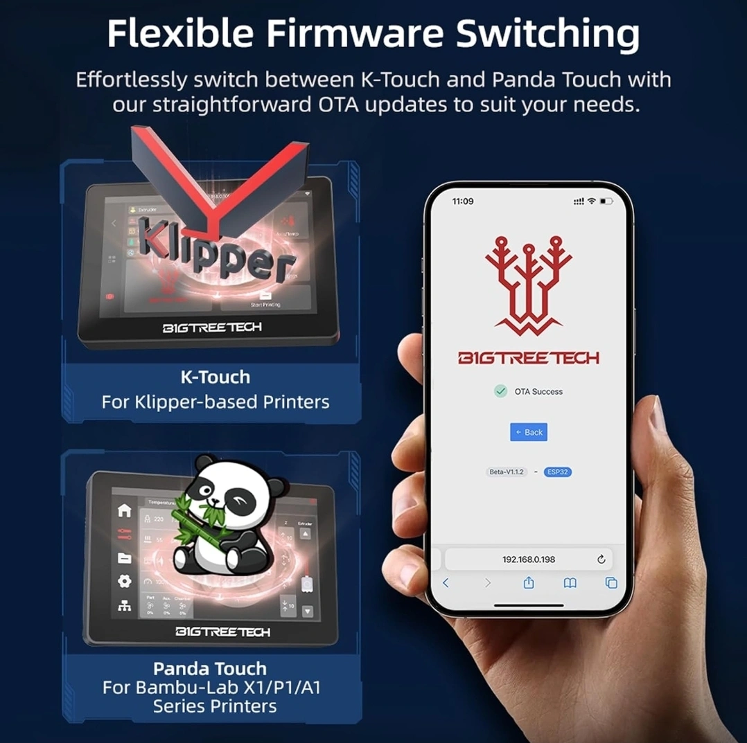 33Get ultimate command over your 3D prints with the BIGTREETECH Panda Touch! This screen is fully compatible with Bambu Lab X1, P1, and A1 series printers. It offers plug-and-play functionality with easy start-up and magnetic charging. Manage up to 10 printers at the same time with its multi-printer management feature, and effortlessly switch between K-Touch and Panda Touch with straightforward OTA updates
