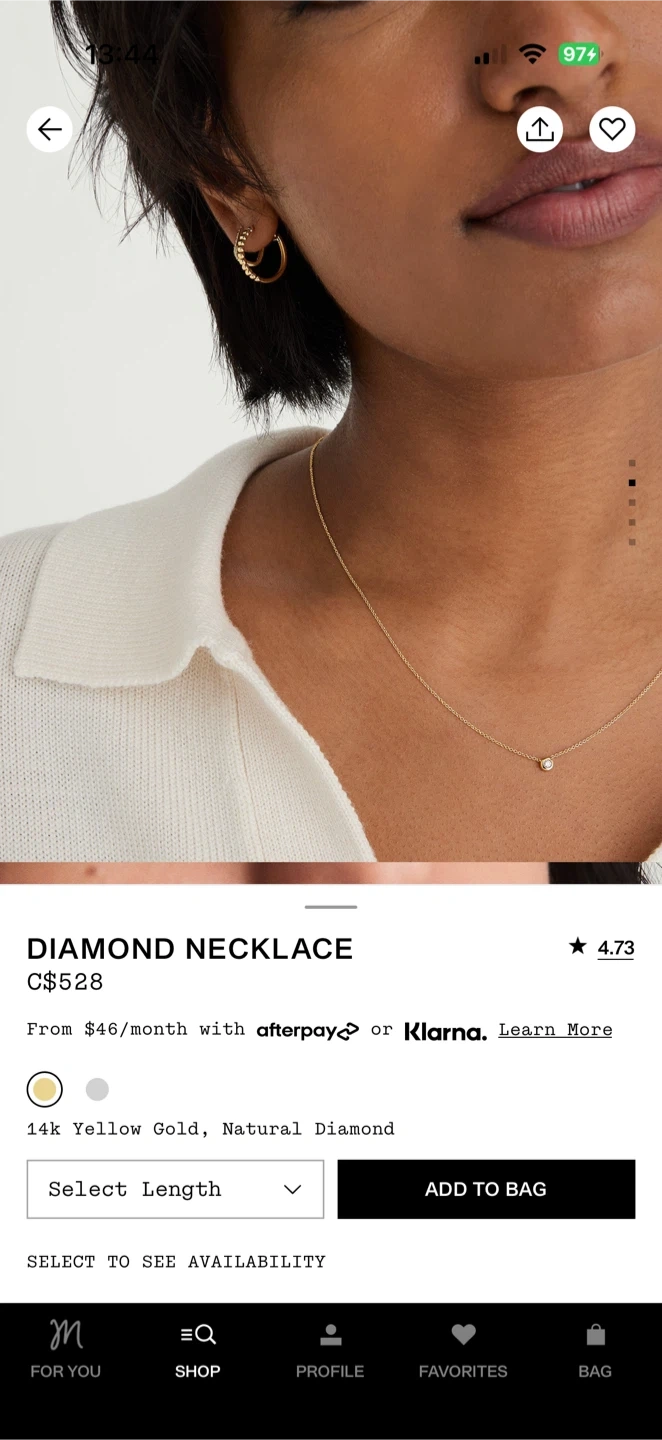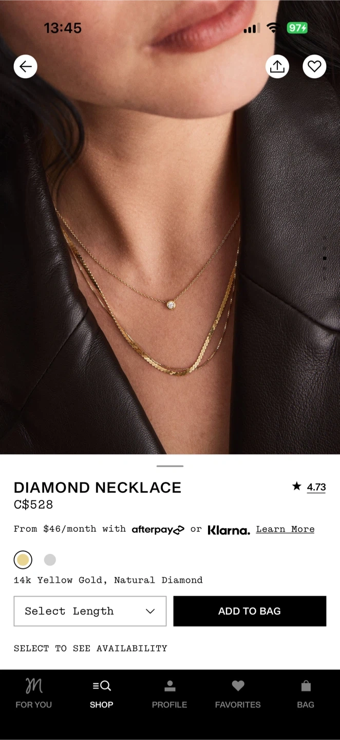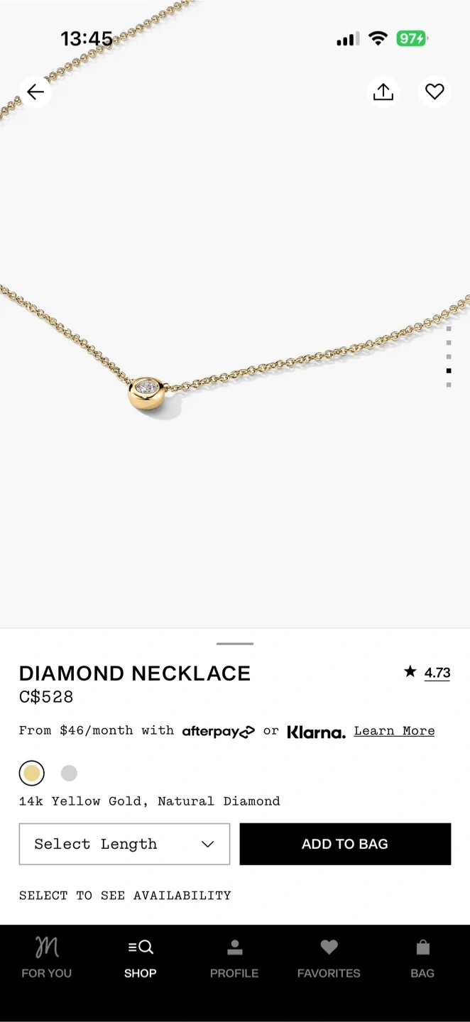 10Selling a beautiful Mejuri diamond necklace! It's made of 14k yellow gold and features a natural diamond. I bought this for $528+tax It's in great condition and would make a lovely addition to anyone's jewellery collection Have been used less than 5times. 16-18inches long