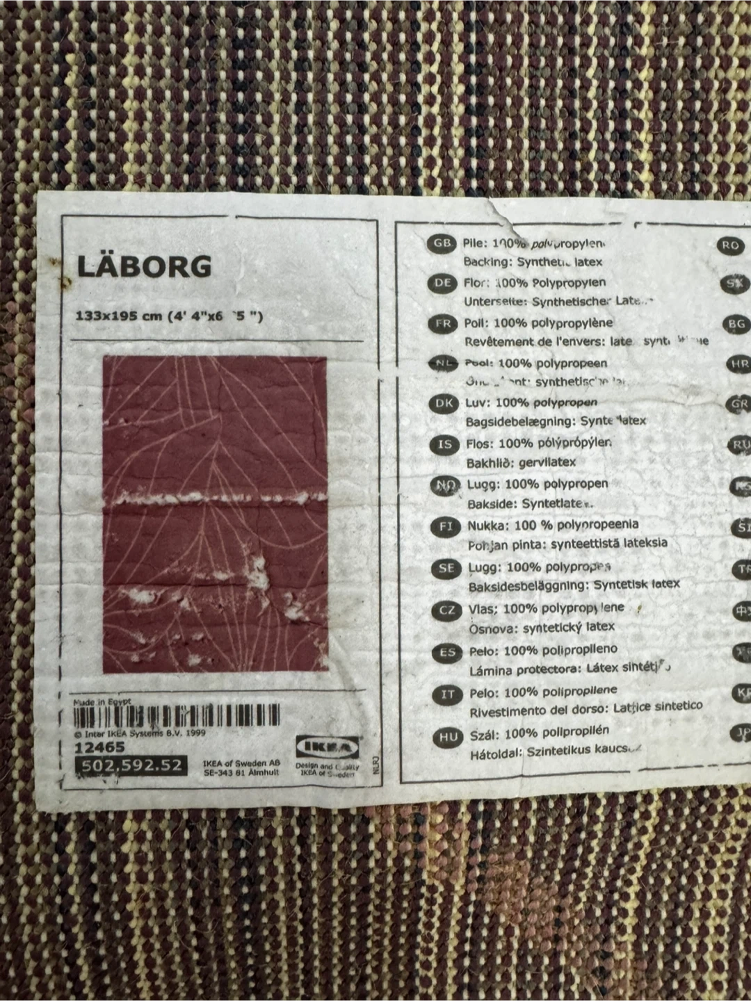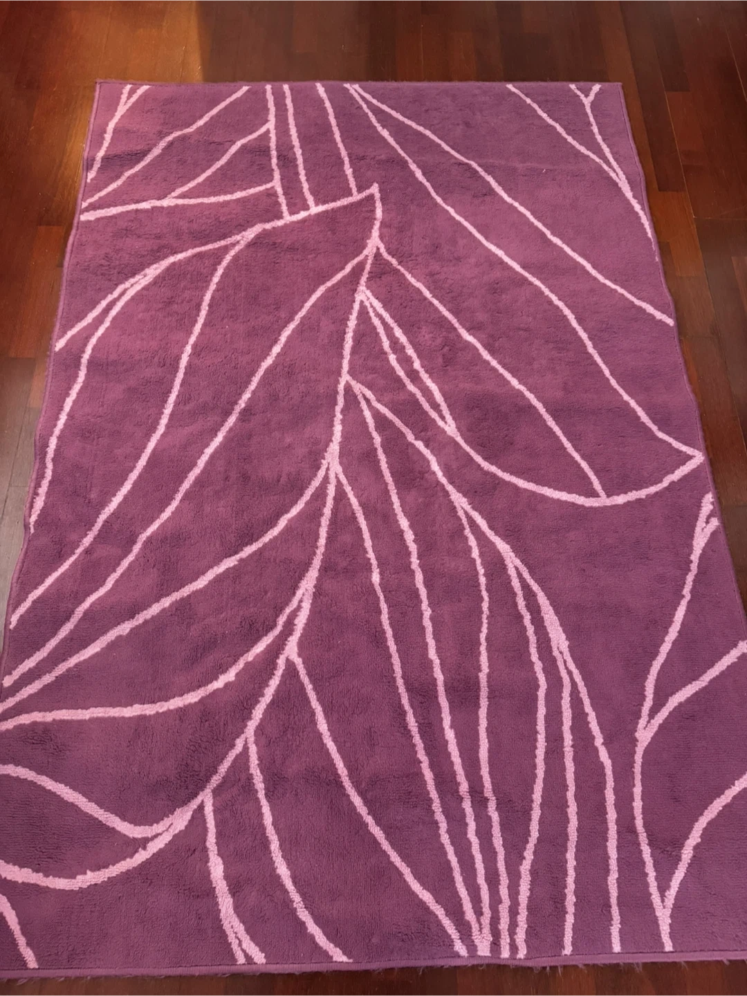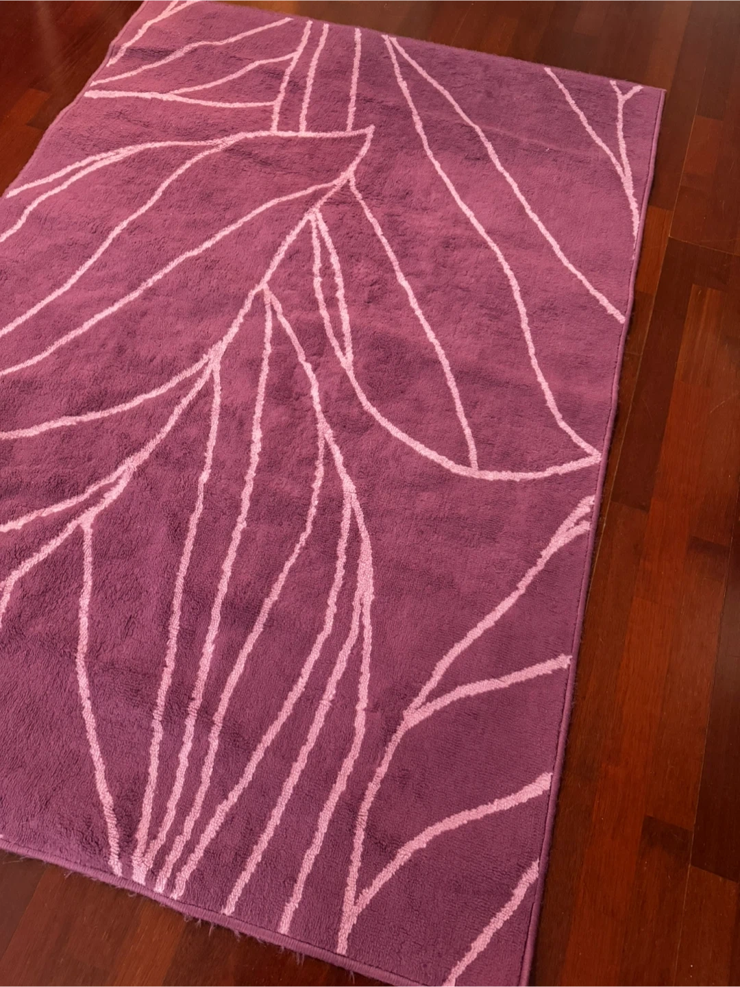 555Ikea Läborg rug, featuring a modern leaf design in shades of purple and mauve, sized at 4' 4" x 6' 5". It's perfect for adding a touch of style and comfort to any room! This eye-catching rug is made of 100% polypropylene, making it soft, durable, and easy to clean. $35 Yonge and finch area