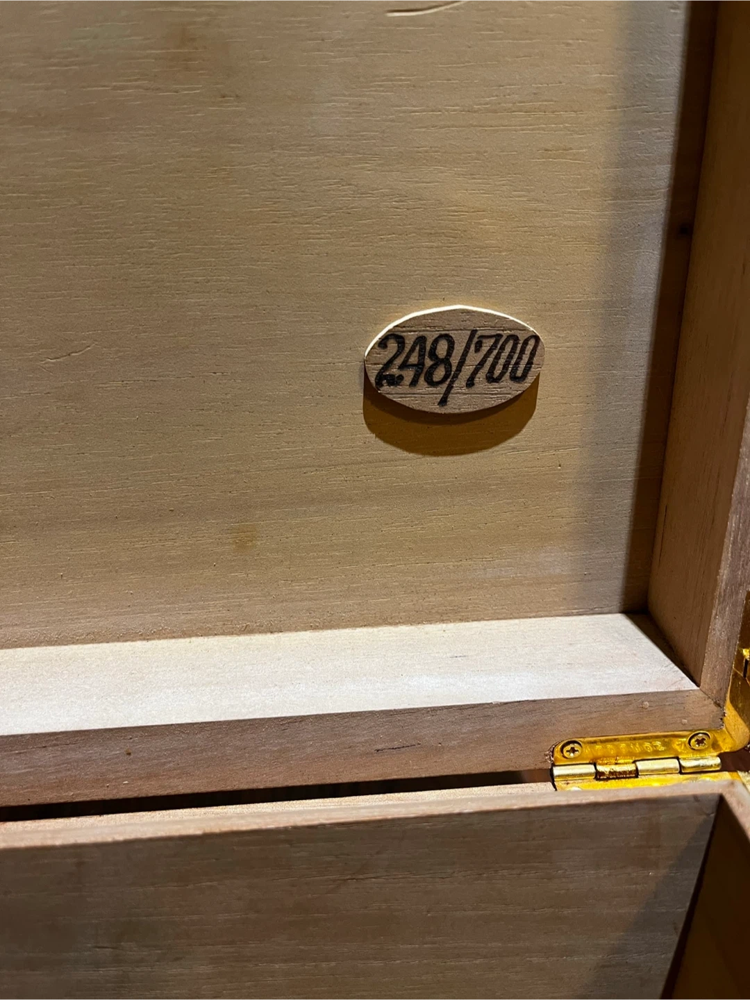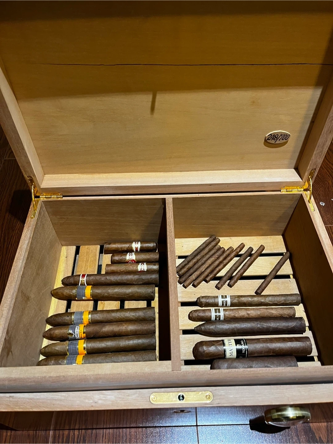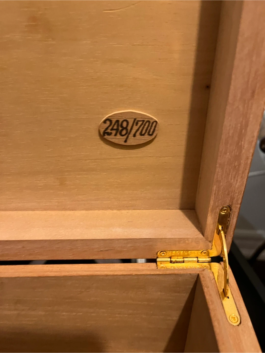 Selling a wooden cigar humidor box! It features a beautiful design on the top and a built-in hygrometer to maintain optimal humidity levels. Inside, there are dividers to help organize your cigars. There is also a small plaque that reads 248/700, indicating it may be a limited edition item. Does not come with cigars.