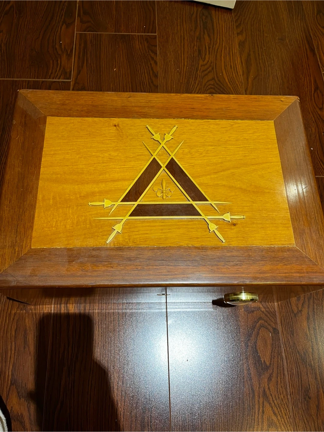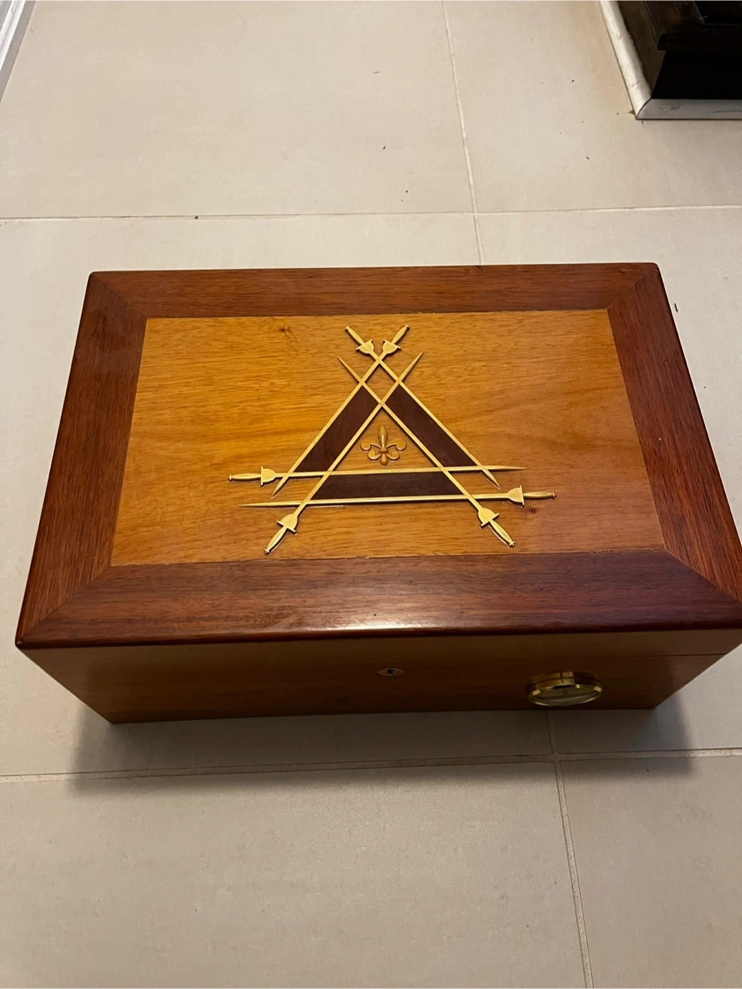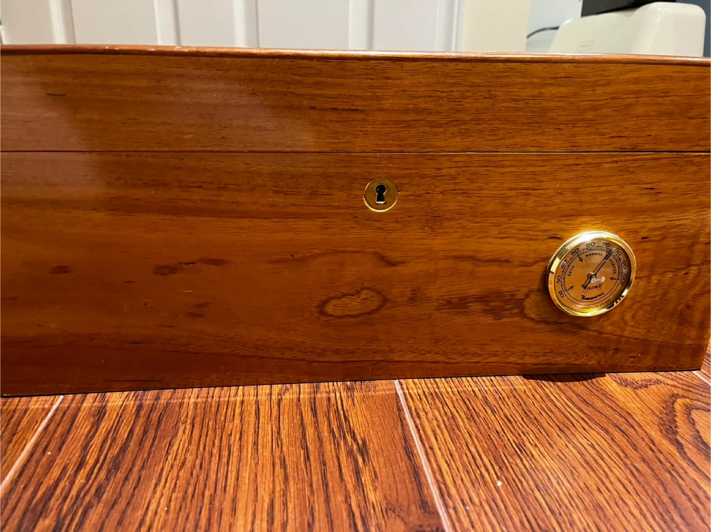 Selling a wooden cigar humidor box! It features a beautiful design on the top and a built-in hygrometer to maintain optimal humidity levels. Inside, there are dividers to help organize your cigars. There is also a small plaque that reads 248/700, indicating it may be a limited edition item. Does not come with cigars.