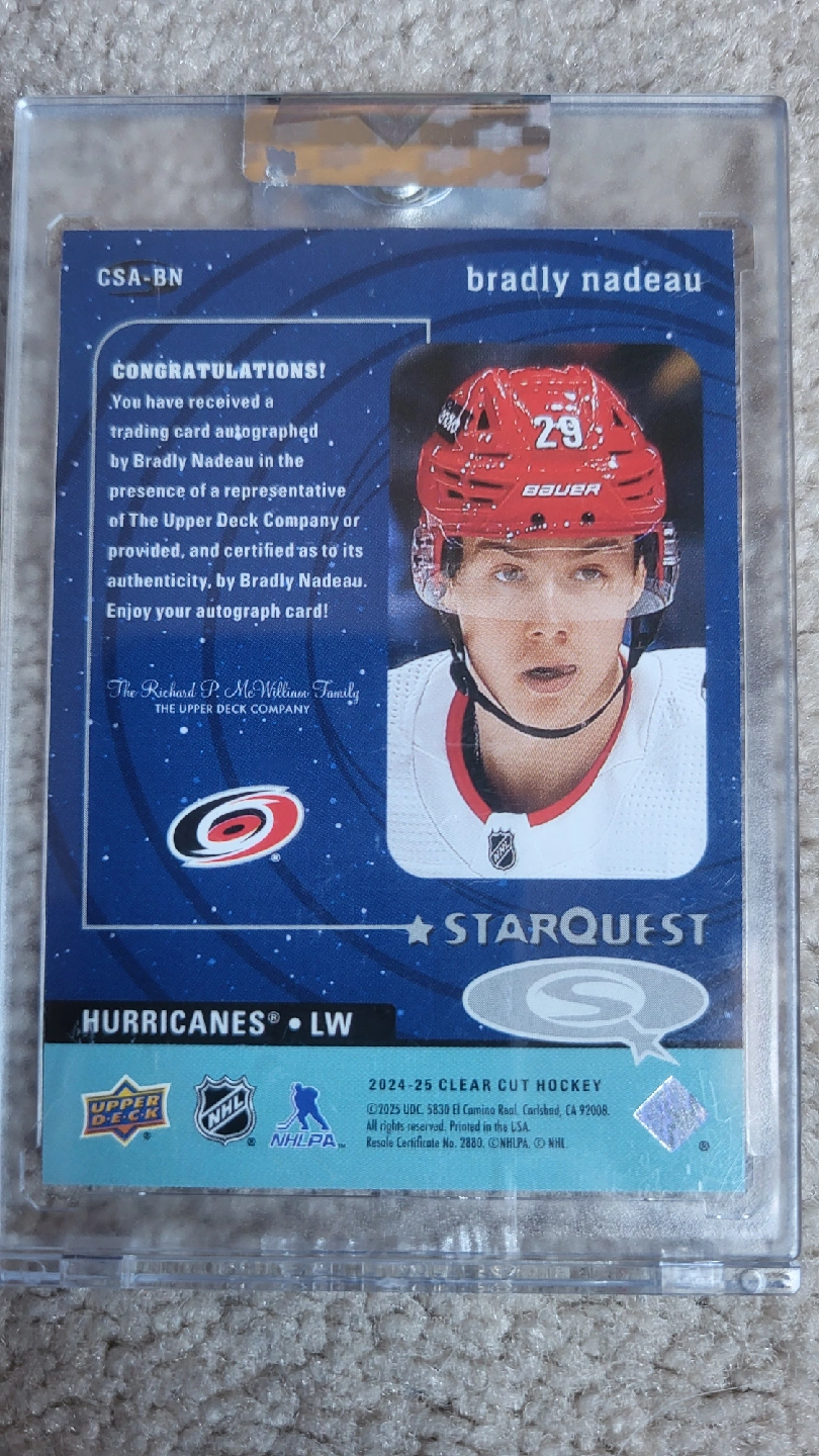 57Selling a Bradly Nadeau autographed trading card. It's from the Upper Deck Company and certified authentic! Features the Hurricanes LW Starquest design. A great addition for any hockey fan or card collector