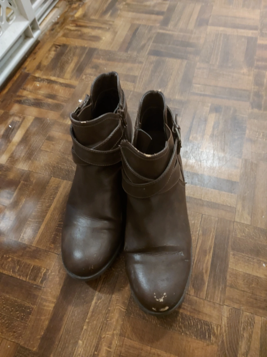 Selling a pair of brown ankle boots in size 9 They have a stylish buckle detail and are perfect for fall. There are some signs of wear, as seen in the photos, but they're still in good condition for everyday wear