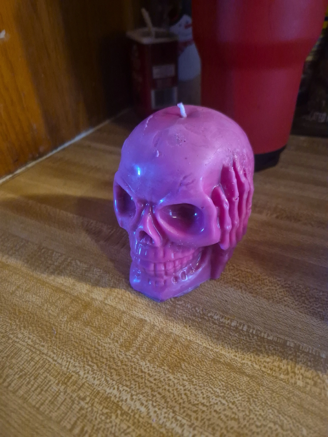 69Selling a unique skull-shaped candle! It's a vibrant pink colour and would make a great decorative piece