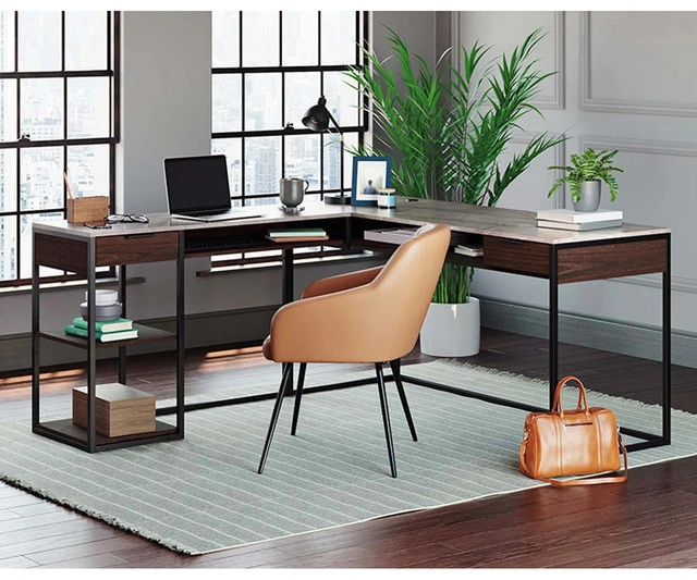 60Umber Wood/Black L-shaped writing desk, brand new in box (BNIB), never used. It sells for $950+tax new. Embrace the timeless, simple elegance of mid-century modern design with the Ludwig rectangular coffee table. With a classic, iconic silhouette in a warm walnut finish, this table features minimalist lines, splayed, tapered legs and brushed brass hardware for a retro look that is always in style. A drawer and shelf space offer ample storage. Exceptionally well-crafted, the Ludwig coffee table is designed with high-quality construction details to ensure it can be enjoyed by future generations. Features Mid-century style with a warm walnut finish Brushed brass drawer pull adds to the timeless aesthetic Constructed from rubberwood solids and walnut veneers for lasting durability and a consistent appearance Drawer provides storage for remotes and other belongings Ball bearing glides ensure smooth operation of the drawer Skillfully constructed dovetail drawer joinery offers long-lasting strength for everyday use Assembly required and hardware included