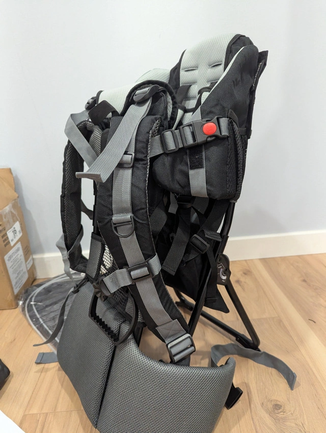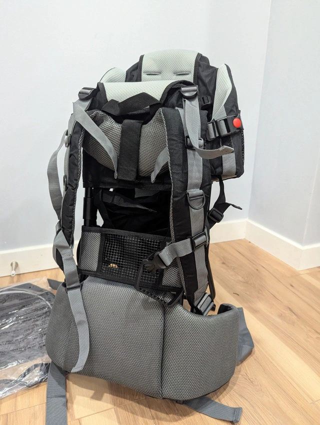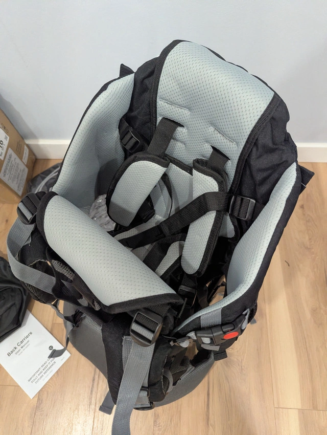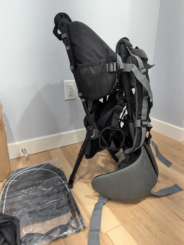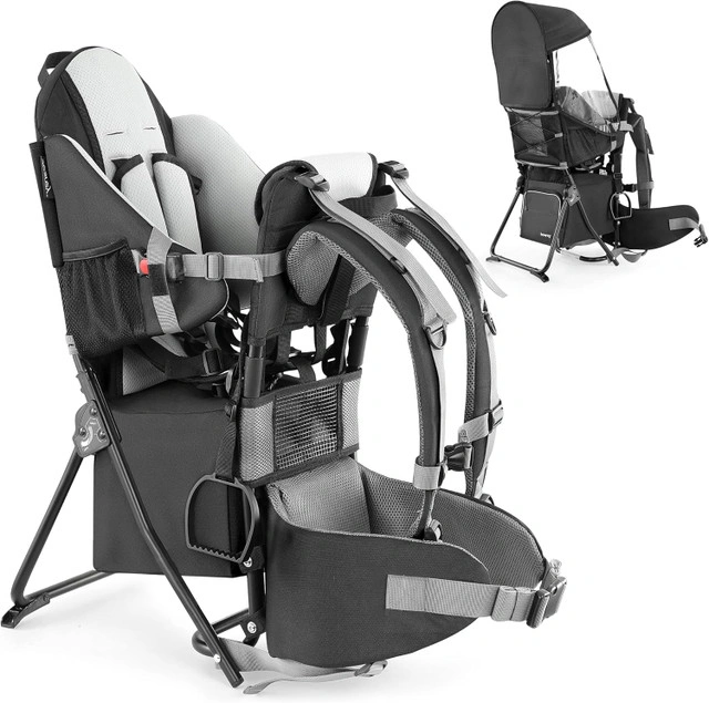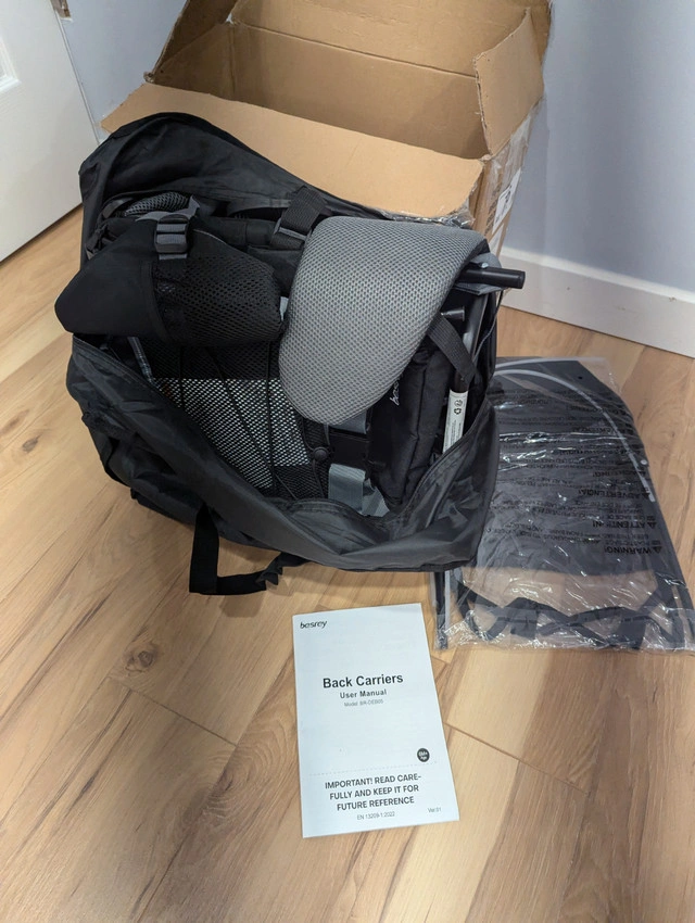 60Brand new in box (BNIB) never used besrey Baby Backpack Carrier, Toddler Hiking Backpack with Safety 3-Height Seat, Adjustable Straps&Waist Belt, Foldable Frame Lightweight Large Capacity Child Carrier for Hiking Black. besrey hiking backpack carrier is specially made keeping in mind the well-being of the toddler. It has 5-point seat belts which are made of super soft material and the flexible straps and stirrups keeps the toddler in a comfortable and safe position while enjoy the trip. To safeguard the kids from sun and rain we have designed a detachable sunshade which can be used when it’s raining, windy or sunny. We also have a washable drool pad for babies to rest their face on something soft and clean. The backpack weighs only around 5.5 pounds but sturdy enough to carry a baby with minimum weight of 16 lbs to a maximum weight of 40 lbs which includes the child, the gears and the carrier. The buckles are designed in such a way that it can fit a large number of parents with different shapes. The shoulder padded and waist belt are very convenient and benefits in spreading the weight equally on your shoulders and waist. The backpack has ample space in the form of pockets to keep diaper wipes, water bottles, flashlight, light gear in there without a problem. It also has storage space under the seat and small zipper pockets on the side of the waist belt giving you enough space to store and carry things hassle free. We also attach a storage bag in case you want to pack up stuff.