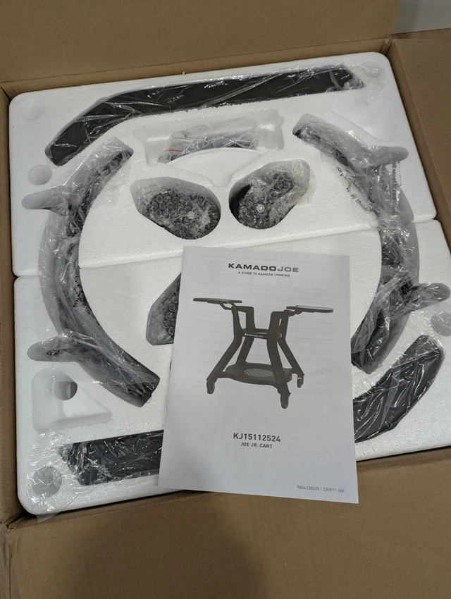 60Kamado Joe Jr Rolling Cart with Folding Side Shelves. Heavy duty powder-coated steel rolling cart for the Joe Jr portable grill. Raises the height of the Joe Jr 31-inches off the ground. Two folding side shelves to provide additional food preparation space. Bottom shelf with custom fit for Joe Jr surfaces and heat deflectors. Four swivel casters for easy movement of the grill. Tool hooks on side shelves for hanging of cooking utensils. Fold up side shelves for compatibility with Joe Jr grill cover. Brand new in box, never used.
