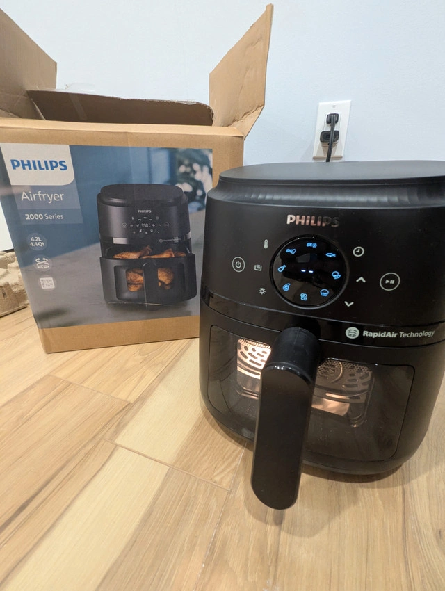 60Brand new in box, never used. Originally $170+tax ($192). 13 Cooking Functions, RapidAir Technology CRISP & HEALTHY COOKING: RapidAir technology ensures deliciously crisp results with up to 90% less fat*. Enjoy guilt-free frying. COOKING WINDOW: No more guessing. Keep an eye on your food to watch while it cooks and see when it's done to perfection! INTUITIVE TOUCHSCREEN CONTROL: Effortlessly navigate settings with the user-friendly touchscreen interface for precise cooking. VERSATILE COOKING OPTIONS: Choose from 13 cooking methods at the touch of a button, from frying to baking and grilling. ENERGY-EFFICIENT PERFORMANCE: Save time and lower energy bills with efficient cooking processes that don’t compromise on taste. EASY CLEANUP: Cooking window lets you monitor food as it cooks while ensuring quick and easy cleanup afterward.
