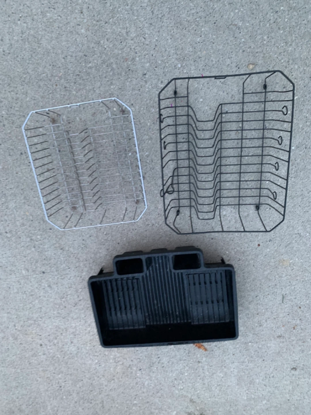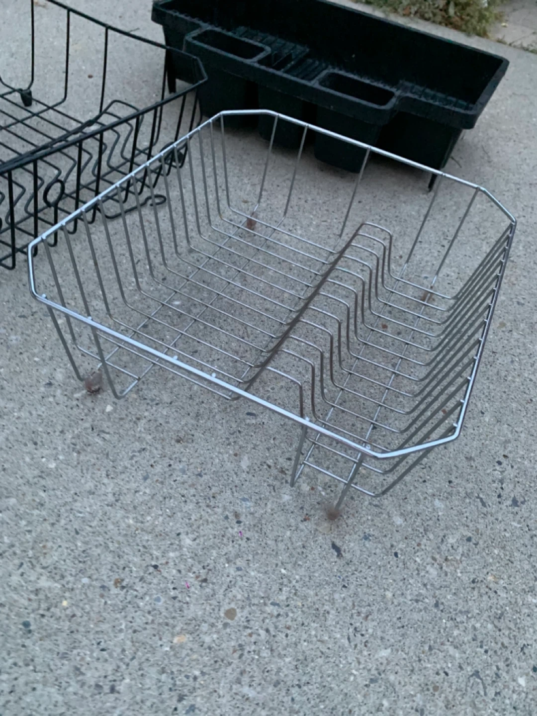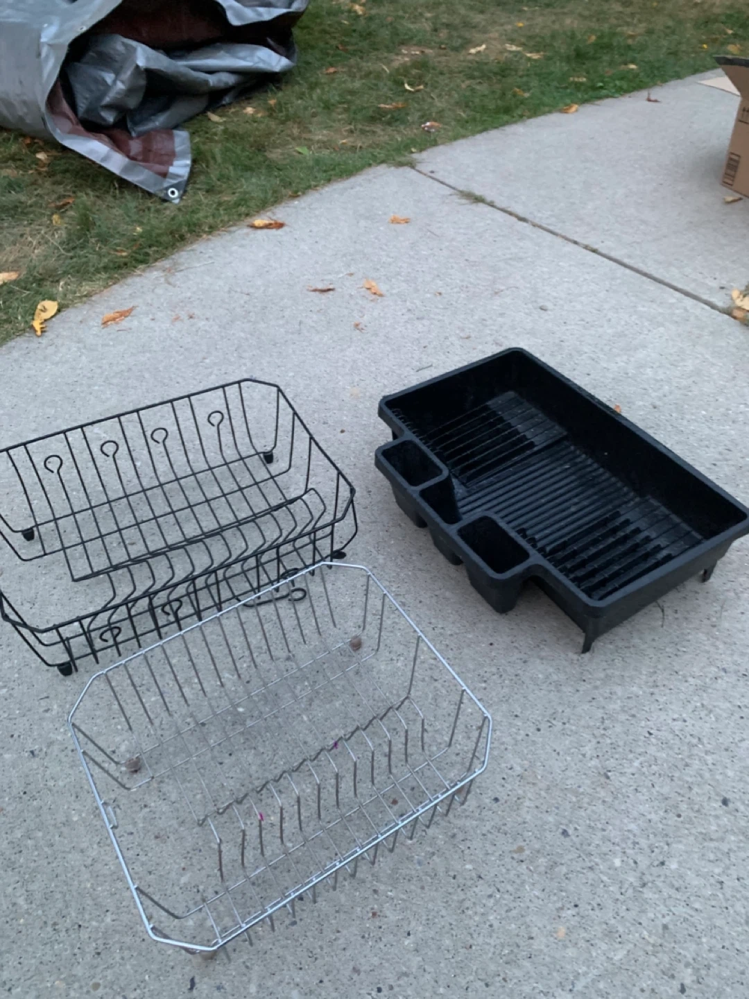 Selling a set of dish drying racks. Includes a black wire rack, a silver wire rack, and a black plastic tray. They're in good condition and ready for a new home