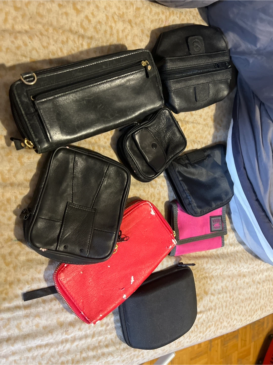 Selling a mixed lot of wallets and small bags. There are various styles and colours, including black and red. Some show signs of wear, as pictured. Great for organizing or repurposing!