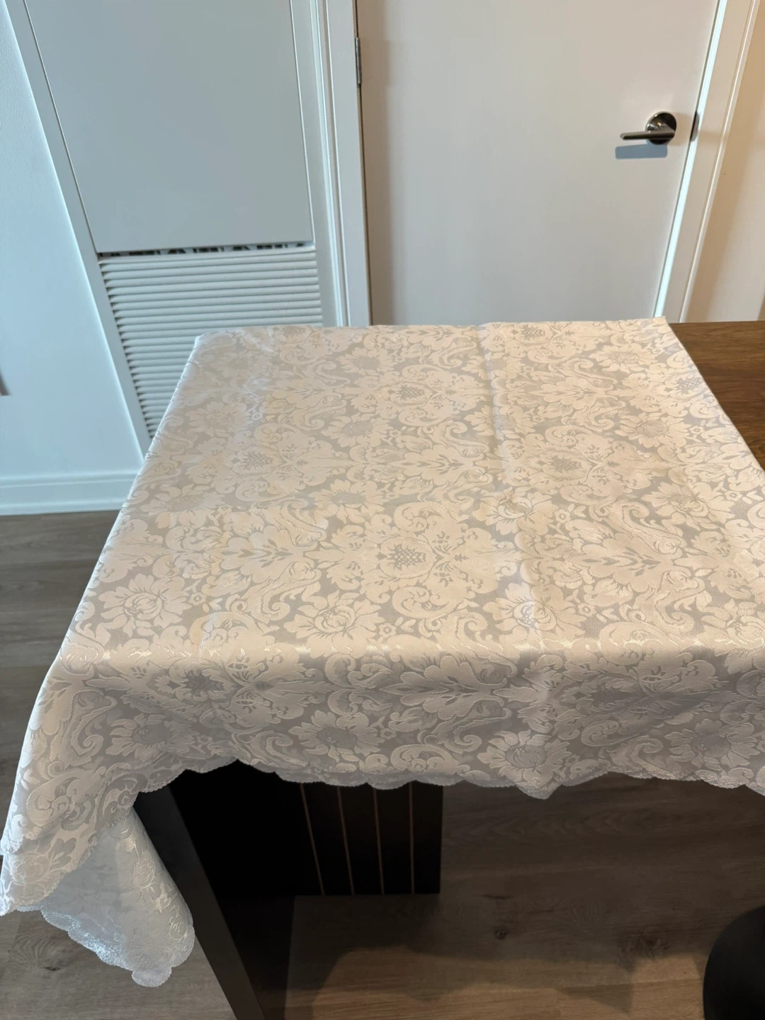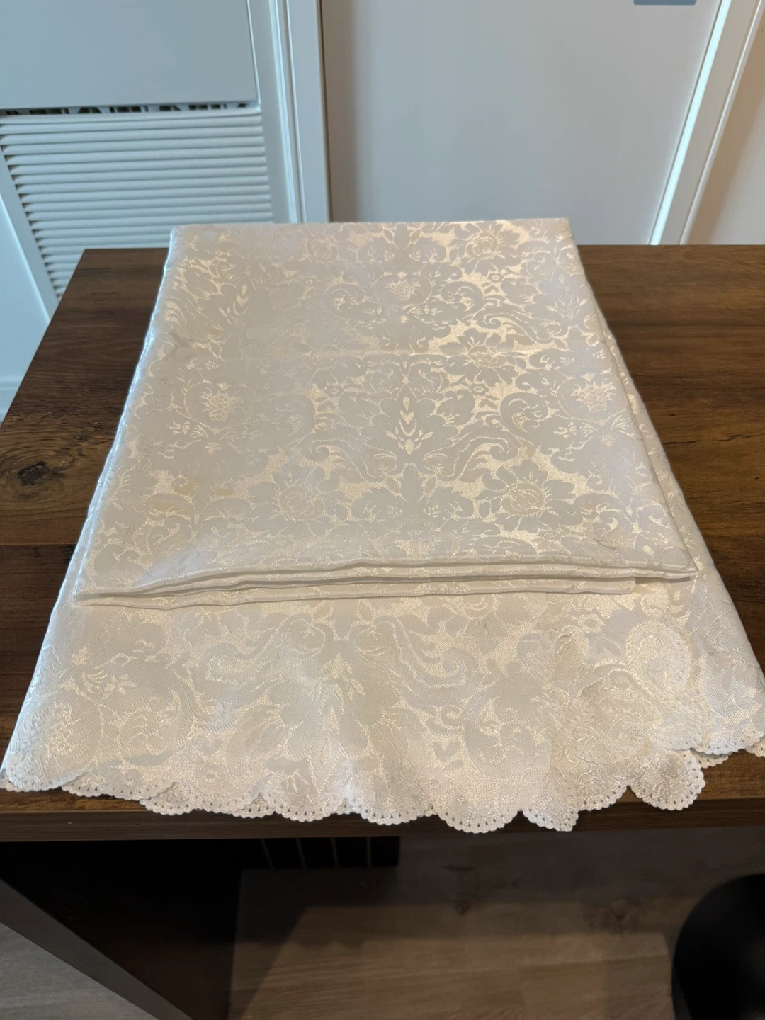 15Selling a beautiful white tablecloth with a subtle floral pattern. It's in great condition and would add a touch of elegance to any dining table. Perfect for special occasions or everyday use!