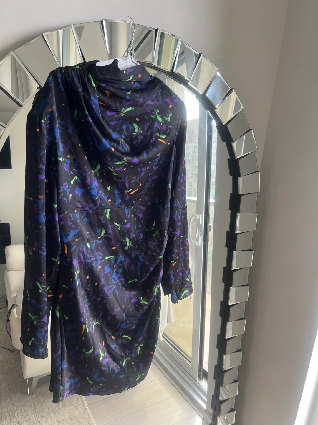 Selling a Marciano dress in great condition! The dress features a unique abstract pattern with blue, green, and purple accents on a dark background. Perfect for a night out or a special occasion