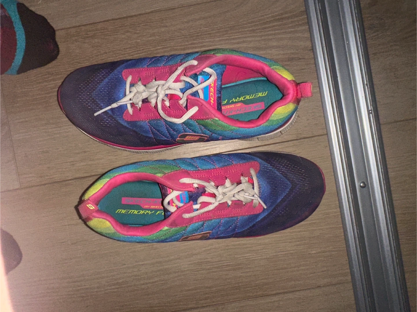 Selling a pair of Skechers sneakers with Memory Foam insoles. They feature a vibrant colour scheme with pink, blue, and rainbow accents. Perfect for adding a pop of colour to your everyday look!