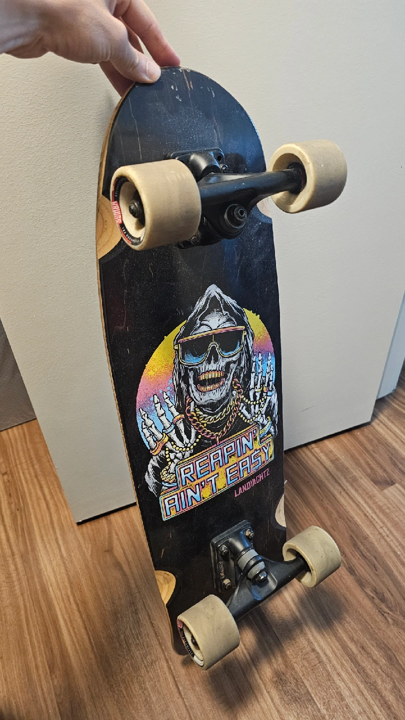 Selling a Landyachtz cruiser skateboard with a cool 'Reapin' Aint Easy' graphic! It's got a black deck and light-colored wheels. Great for cruising around town!
