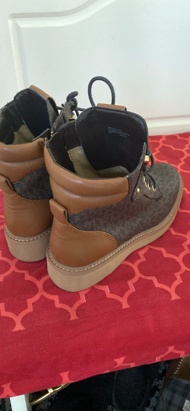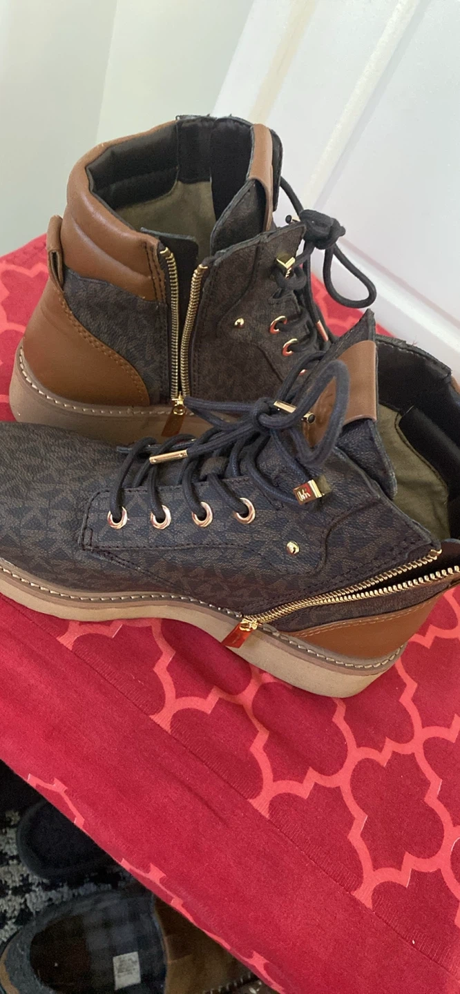 Cute Michael Kors boots featuring a brown and black design! They have laces and zippers for easy wear. Perfect for adding a stylish touch to any outfit