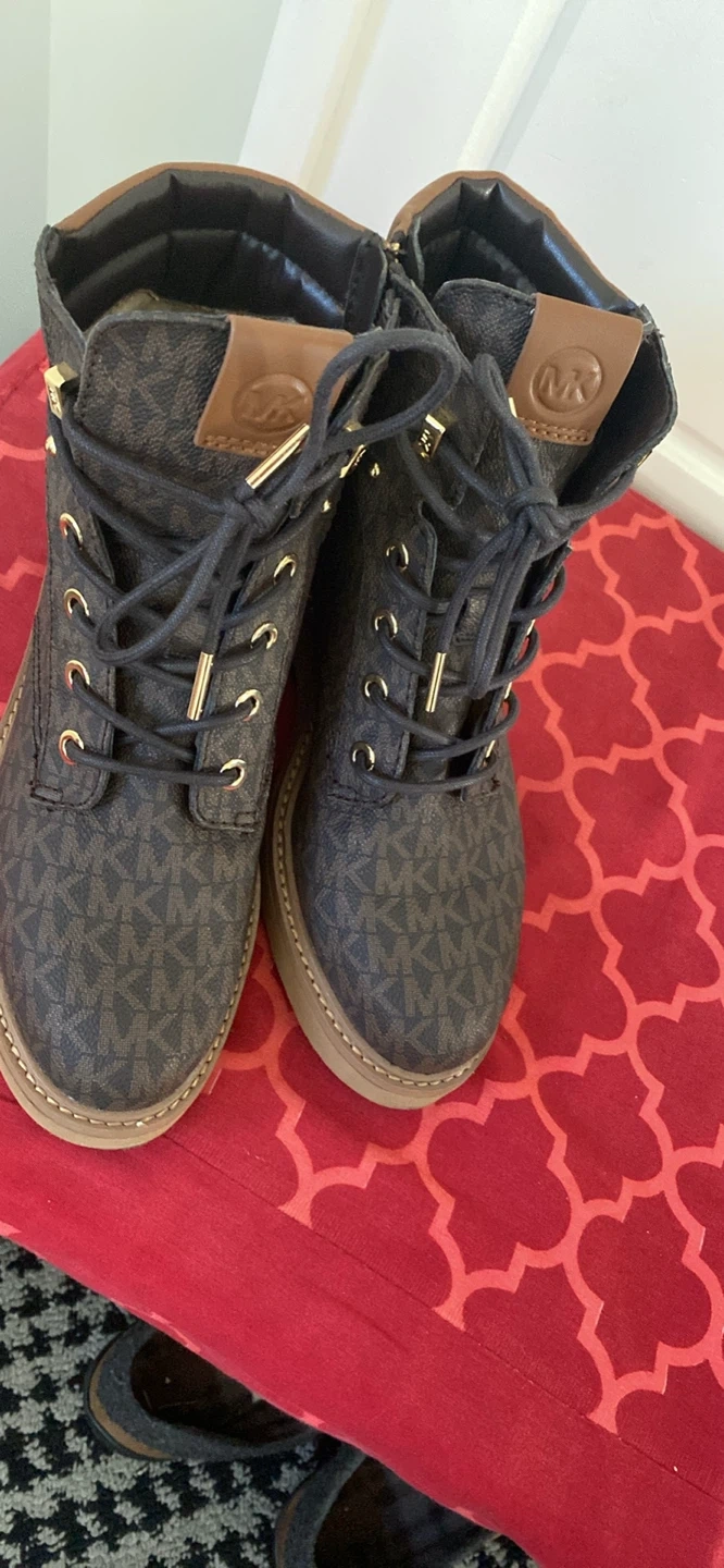Cute Michael Kors boots featuring a brown and black design! They have laces and zippers for easy wear. Perfect for adding a stylish touch to any outfit