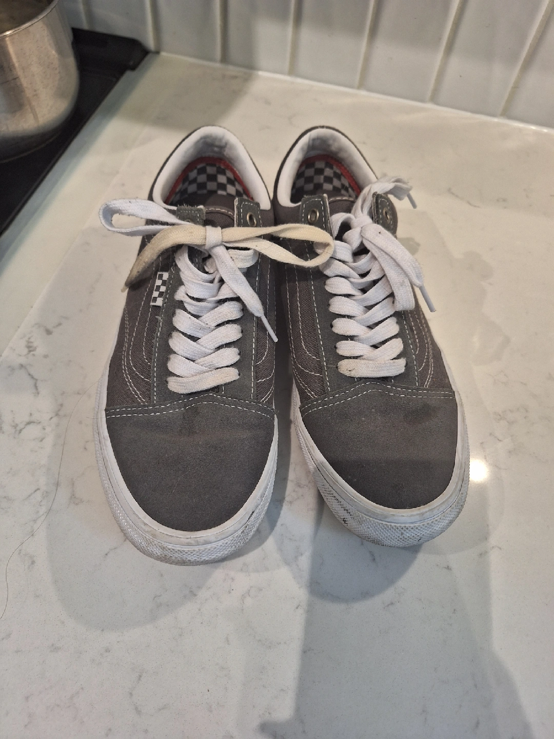 Selling a pair of grey Vans Old Skool skate shoes. They have some wear and tear, but are still in good condition for skating or casual wear! men's size 10