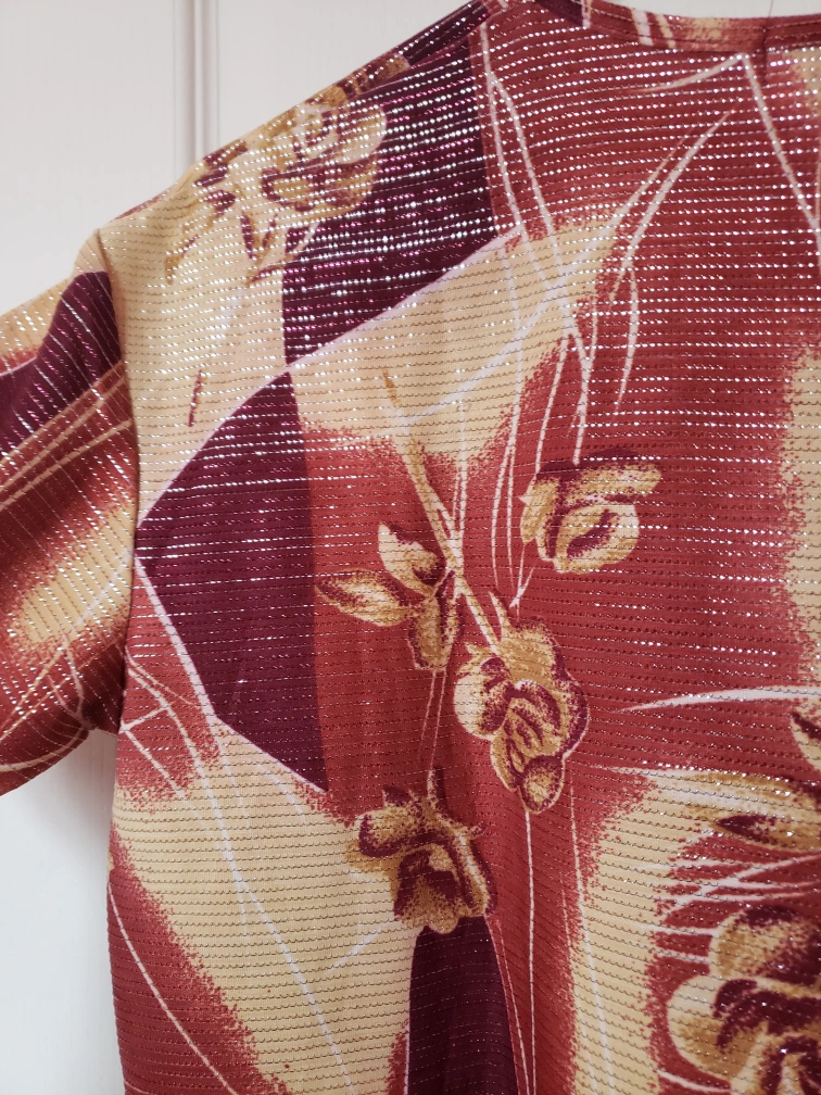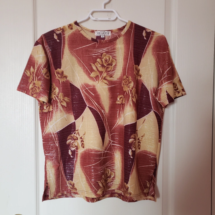 Giving away a short sleeve, metallic rose print shirt with a relaxed fit
