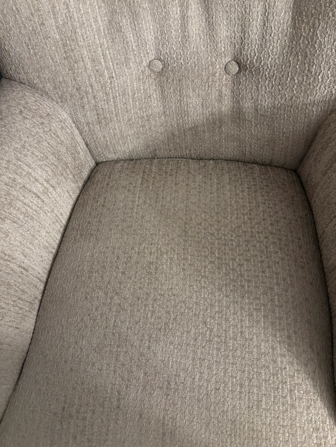 Selling a wingback armchair in a neutral-toned fabric. It's in great condition and would be a lovely addition to any living room or reading nook! The chair features button detailing on the back and decorative nailhead trim on the arms.